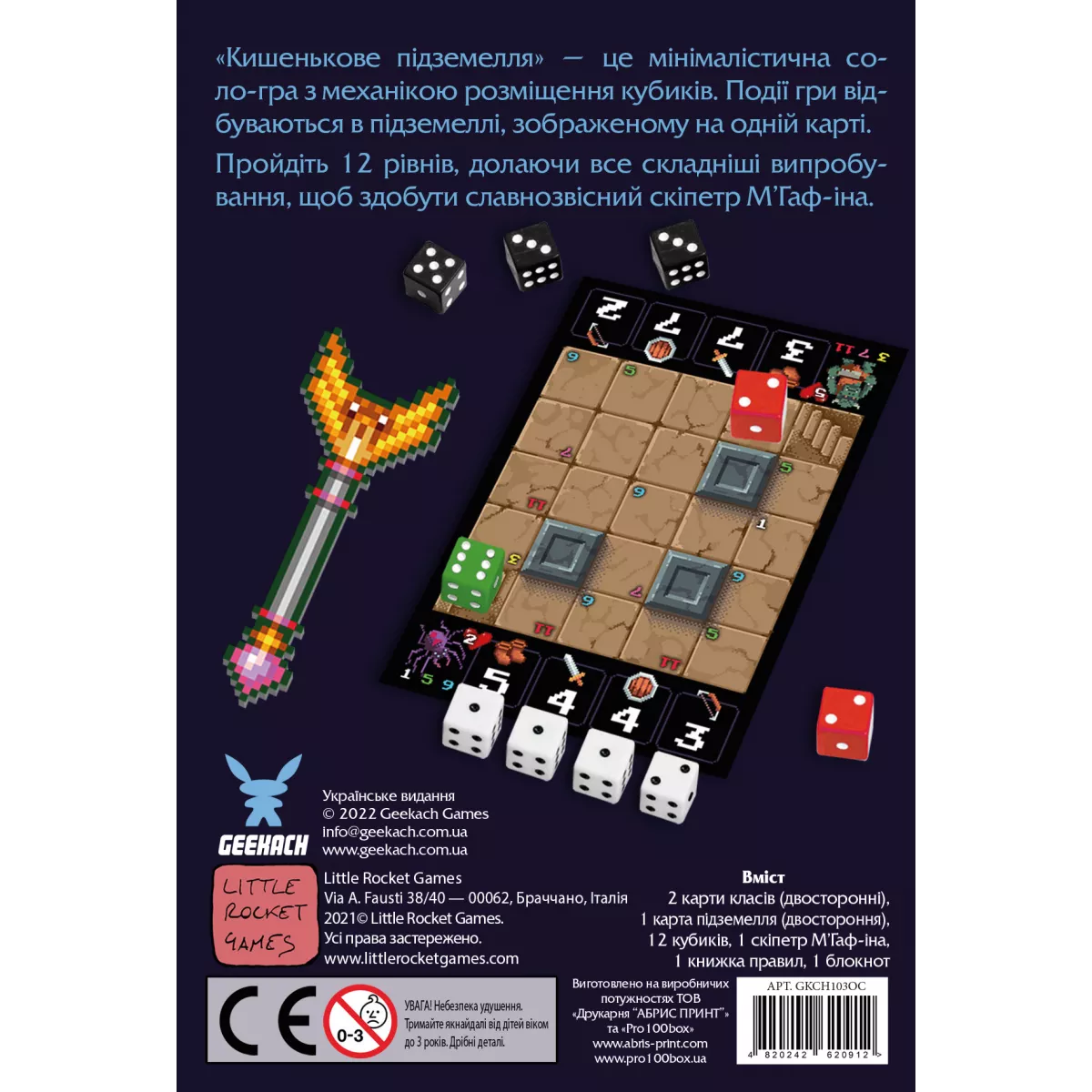 Хоробрий Паладин, ви готові увійти у таємниче підземелля у пошуках славнозвісного скіпетру М’Ґаф-іна? Тільки будьте уважні, адже ці печери дуже вузькі, тому в подорож доведеться відправлятися самотужки, без супутників, ручних мавпочок та могутніх джинів. Гра Кишенькове підземелля - це невеличка соло пригода, у якій вам самотужки необхідно подолати 12 рівнів підземелля. Гра є дуже швидкою та компактною, вона ідеально підійде для подорожей, або щоб зайняти себе під час очікування. Необхідно лише мати відносно рівну поверхню, аби на неї кинути кілька дайсів. А дайси ці покажуть, скільки очок дій ви матимете для переміщення, атаки та захисту. Значення основного куба вашого героя та монстрів вказують на поточну кількість очок здоров’я. Якщо ви зможете подолати всіх ворогів на рівні, то він вважається пройденим і можна полікуватись, покращити власні характеристики та переходити до наступного випробування, яке буде більш складним. У випадку, якщо вам хочеться більше різноманіття в ігровому процесі, ви можете відправити у підземелля не Паладина, а одного з інших доступних героїв: варвара, лучницю або чарівницю, кожний з яких має унікальні особливості та власні початкові характеристики. Тож якщо ви хотіли б розважити себе швидкою пригодою, у якій механіки базуються на логіці та удачі, Кишенькове підземелля – це саме та настілка, яка стане вам у нагоді повсякчас! Коли ж ви хочете більш казковий антураж для соло гри – зверніть увагу на настілку За Нортвуд!