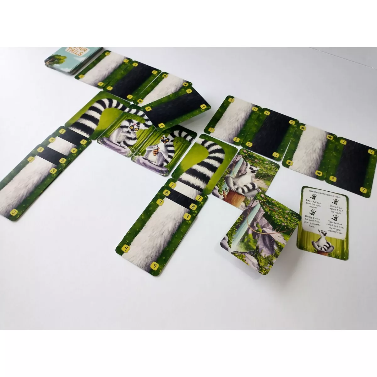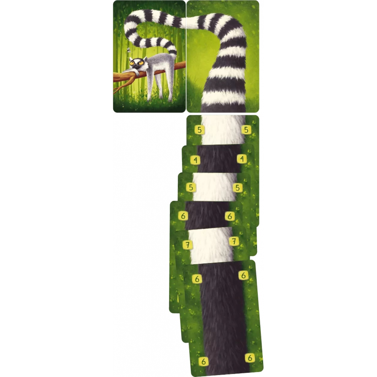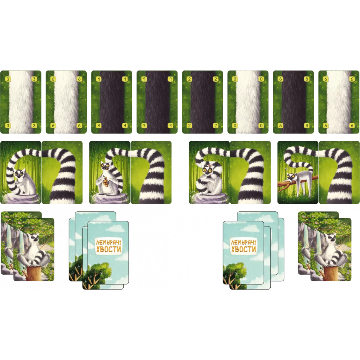У коробці 40 карт білого хвоста, 40 карт чорного хвоста, 4 двобічних карти лемурів, 4 двобічних карти початку хвоста, 12 карт лемурів-сонцепоклонників, 8 карт-джокерів, 1 карта кінця гри, 1 карта-пам’ятка