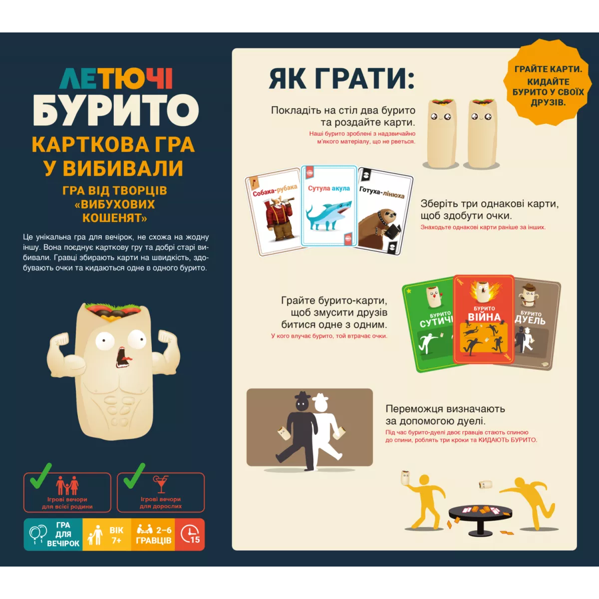 «Летючі бурито» – це унікальне поєднання карткової гри зі збиранням сетів і захопливої фізичної взаємодії, де гравці буквально кидаються м'якими бурито одне в одного. Від творців гумористичної «Вибухових кошенят» (Exploding Kittens) ця гра взяла найкраще: простоту правил, блискавичну динаміку та величезну порцію гумору. Мета гри – збирати сети з однакових карт, але будьте обережні: як тільки з'являються картки бурито-битви, починається справжній махач! Ваша спритність та швидкість реакції стануть вашими головними союзниками у цій битві.