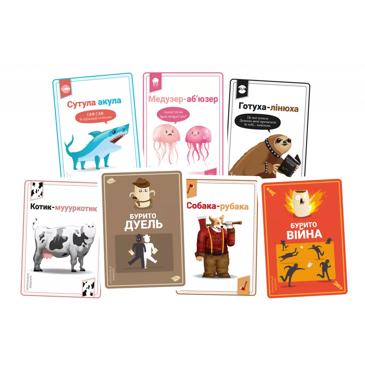 Тут в гру вступає механіка «спритність» у повній мірі. Ухилятися, ловити, кидати – все це потрібно робити швидко та точно. Кожне влучання приносить «синець від бурито» – негативні очки, яких, звісно, краще уникати. Графіка на картах, як і в інших іграх від Exploding Kittens, виконана в гумористичному стилі, що додає ще більше позитиву до ігрового процесу. Мовонезалежна версія гри з українськими правилами гарантує, що жоден гравець не залишиться осторонь.
