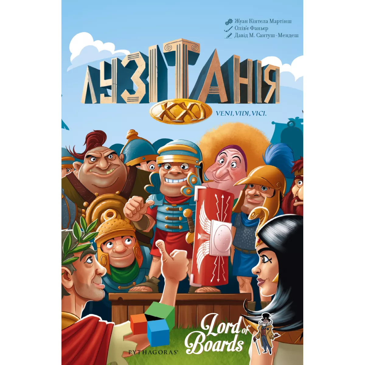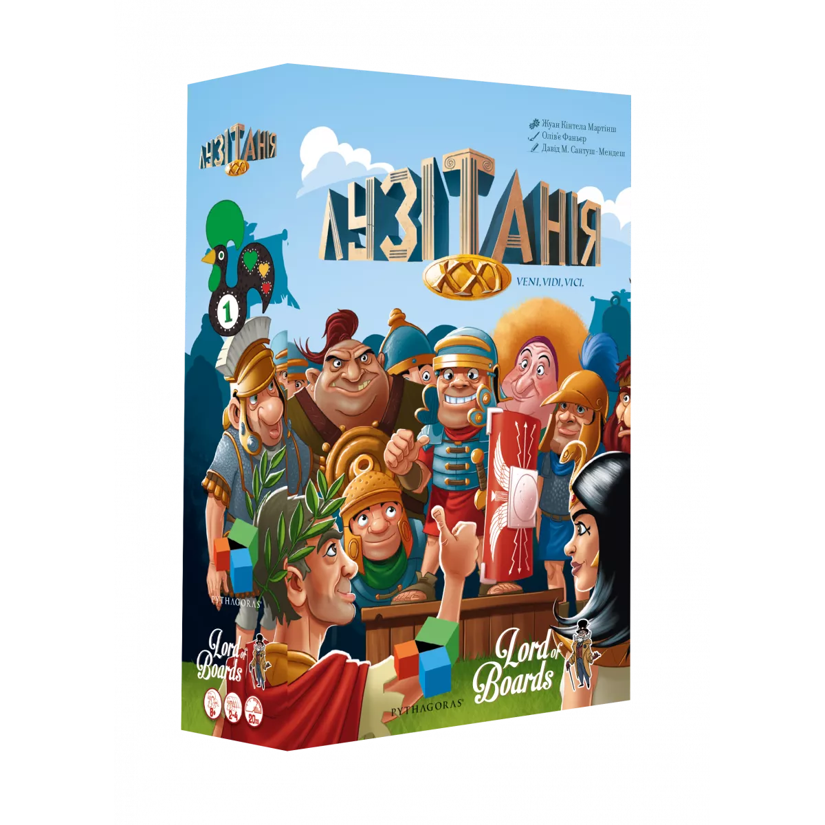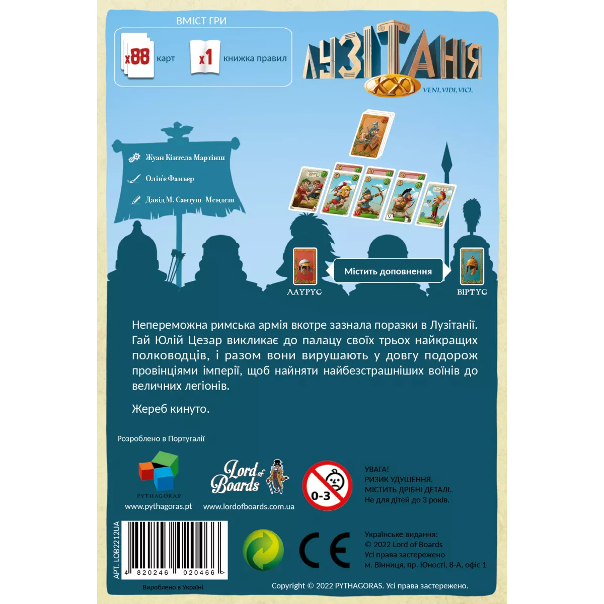 Юлій Цезар лютує, коли до Риму доходять жахливі новини: некерований народ Лузитанії вкотре дав відсіч військам Римської імперії. Імператор обирає трьох найкращих командирів і наказує їм зібрати найбезстрашніших легіонерів разом із найманцями, після чого чотири легіони будуть відправлені в Лузитанію для придушення опору. Цезар і сам очолить один із легіонів, оскільки більше не готовий зазнавати поразки. Лузитанія XXI (Lusitania XXI) – репринт настільної гри Lusitania, випущеної в 2017 році. На учасників чекають ще яскравіші елементи, ще більш насичені пригоди, ще більш непрості рішення. Вступайте у напружену битву і не залиште своїм супротивникам навіть шансу на перемогу. Жереб кинуто Битва обіцяє бути напруженою, оскільки легіонери та найманці рішуче налаштовані порадувати імператора, а сам Юлій Цезар не має намірів миритися зі свободолюбством Лузитанії. Брати участь у партії можуть від 2 до 4 осіб. Гравцям доведеться використовувати списи, мечі, луки та стріли, щоб досягати своїх цілей. Під час поєдинку ви можете розміщувати карти зі своєї руки в ряд, використовуючи вільні слоти. Також є можливість обмінюватися картками з іншими гравцями, прагнучи отримати ті, які допоможуть у виконанні поставлених цілей. Ходять учасники по черзі, під час ходу їм доступні три основні дії: торгівля – можна взяти одну карту з тренувального поля та обміняти її на карту з руки; вербування найманців – можна одну карту з руки перемістити у власну армію; скидання однієї картки. Один раз за хід, до або після обов’язкової дії, учасник має право виконати безкоштовну дію, активувавши одну картку Відвідувача або Бога Марса. Карти відвідувачів мають свої унікальні ефекти. Наприклад, Юлій Цезар дозволяє прибрати всі карти тренувального поля в стопку скидання і взяти 4 нові карти, а з Сенатором можна замінити будь-яку свою карту на одну випадкову карту з рук опонентів. Переможці та переможені Гра закінчується негайно, якщо один із гравців набирає 21 очко або більше. Такий результат автоматично робить його переможцем. Важливо не забути відняти очки за всі карти Музикантів, що лежать лицьовою частиною догори. Трапляється і так, що в колоді закінчуються карти. Тоді необхідно перетасувати стопку скидання та сформувати нову колоду. Якщо вона закінчилася вдруге за гру, то партія завершується. Після цього учасники підраховують очки та перемагає той, у кого їх найбільше. У разі нічиєї перемагає гравець, який володіє карткою Юлія Цезаря. Лузитанія XXI (Lusitania XXI) відрізняється від попередньої версії наявністю додаткових карт та ефектів. Гра змушує не просто сліпо керувати картами, а продумувати кожен крок, вибудовувати власну стратегію та шукати способи перехитрити опонентів, оскільки тільки таким чином можна отримати вигідні комбінації та зібрати найсильнішу армію. Чи зможете саме ви стати видатним полководцем та генієм військової справи, залишивши свій слід в історії Римської імперії? Скоріше починайте партію, щоб з’ясувати це.
