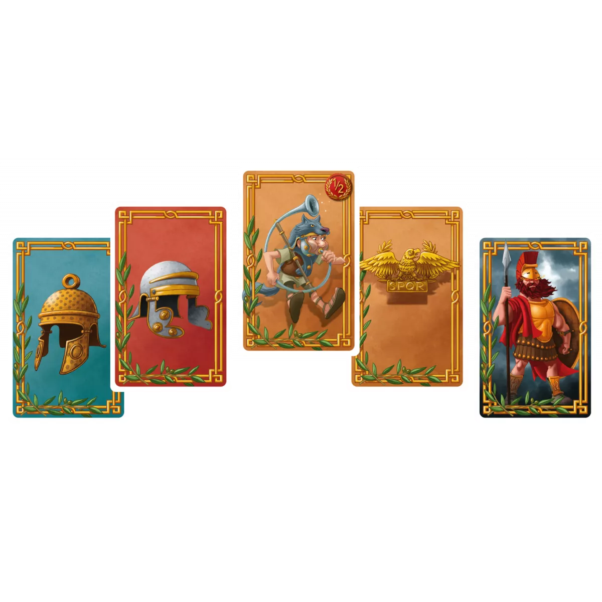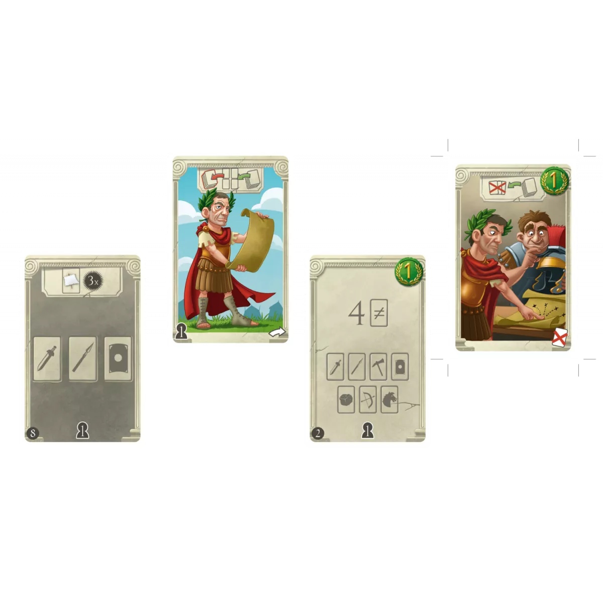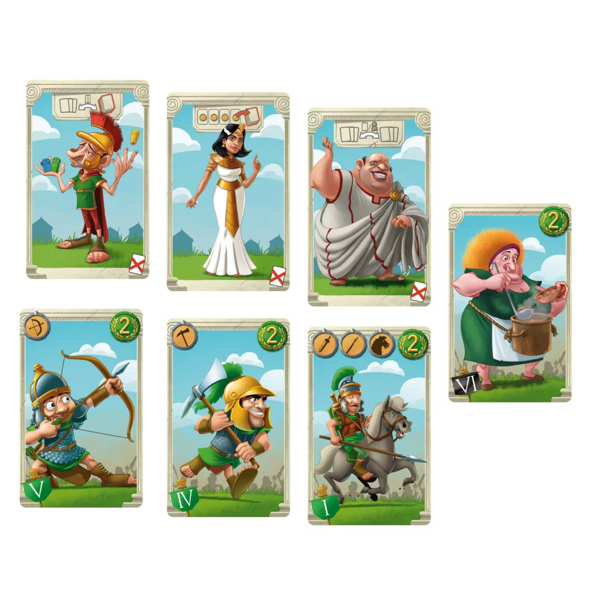 У коробці 26 карток солдатів -, 20 легіонерів (по 5 кожного кольору на кожну провінцію),, 6 найманців-варварів;, 15 карток Відвідувачів;, 26 карт спорядження;, переможні жетони;, карти бога Марса -, 1 Юлій Цезар,, 3 командири;, тренувальна карта.