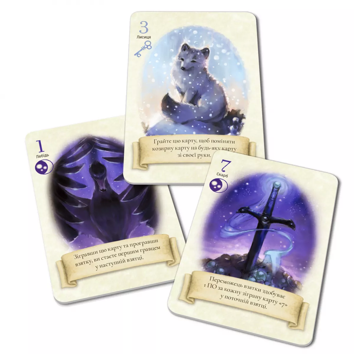«Колись давним-давно…» А може краще: «У темному-темному лісі…» Ні, а давайте краще: «Зустрілися якось у лісі двоє старих знайомих та затіяли собі протистояння…» І розкажемо ми вам цю казку у дуельній настілочці Лис та ліс, в якій двоє гравців змагатимуться за перемогу, забираючи взятки. Ігровий процес на перший погляд дуже простий: обидва гравці отримують на руку випадкові карти трьох мастей різного номіналу, а також відкривають козир з колоди. Далі кожен з гравців, в порядку черги, викладає на стіл карту. Супротивник повинен покласти у відповідь карту такої ж масті. І взятку забирає той з гравців, чия карта старша (вочевидь, козир старший за карти звичайної масті). А тепер перейдімо до найцікавішого! Виявляється, у всіх непарних карт є особливий ефект! Вони можуть змінити порядок ходу, кількість переможних очок, або навіть поміняти козир прямо понезвіданісеред матчу! З цими правилами звичайна проста дуель починає розквітати новими тактичними фарбами, створюючи незвідані маршрути для перемоги та даючи простір для ще хитріших маневрів! Тому якщо ви хочете зіграти у просту та мальовничу дуель, яка до того ж має комплексне подвійне дно – гра Лис та Ліс точно стане вам у нагоді! Та якщо у вас немає з ким пограти навіть у дуельну гру – це зовсім не привід сумувати, адже ми можемо запропонувати казкову соло-гру для одного За Нортвуд!
