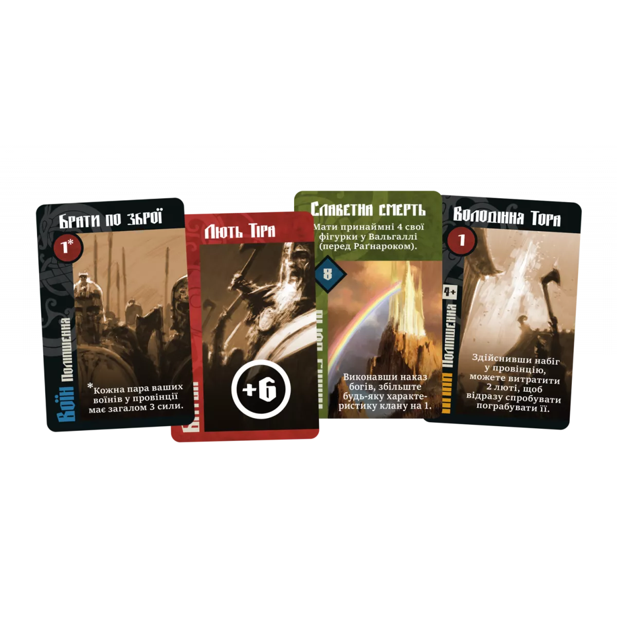 Карти часто пов’язані з скандинавським богом, що дає підказки щодо їх використання. Ці переваги використовуються в частині гри, пов’язаній з контролем території, коли ви боретеся з іншими гравцями за контроль над стратегічними областями дошки. Сила спочатку походить від мініатюр, але може бути збільшена картами. Це включає в себе складні карти, які винагороджують вас за поразку або карають опонента за перемогу в боях!