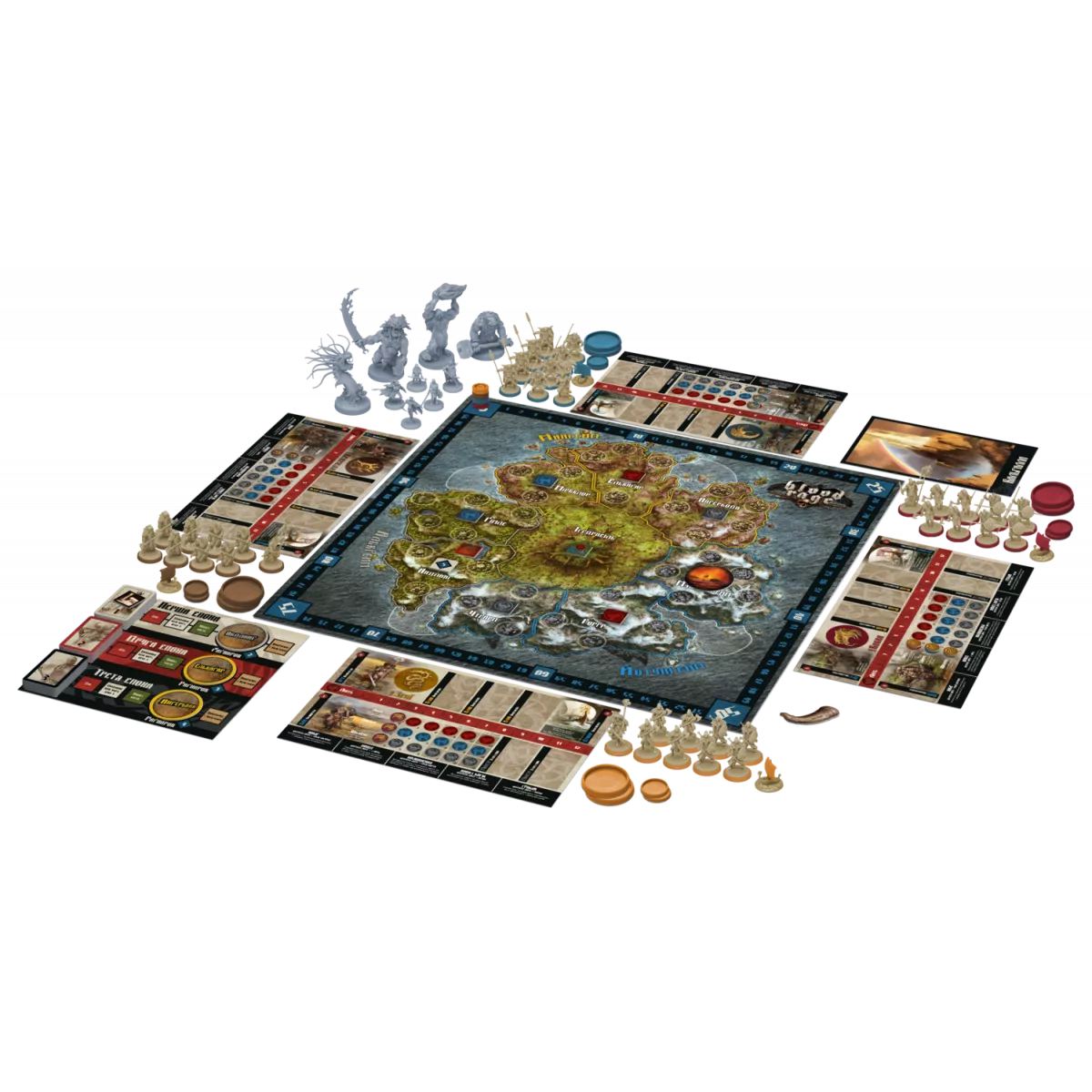 У коробці 49 високодеталізованих пластикових фігурок, 52 кольорові підставки, 4 пластикові маркери очок слави , 102 карти, 1 ігрове поле , 36 жетонів, 4 планшети кланів , 1 планшет епох , 1 планшет Вальгалли, книжка правил