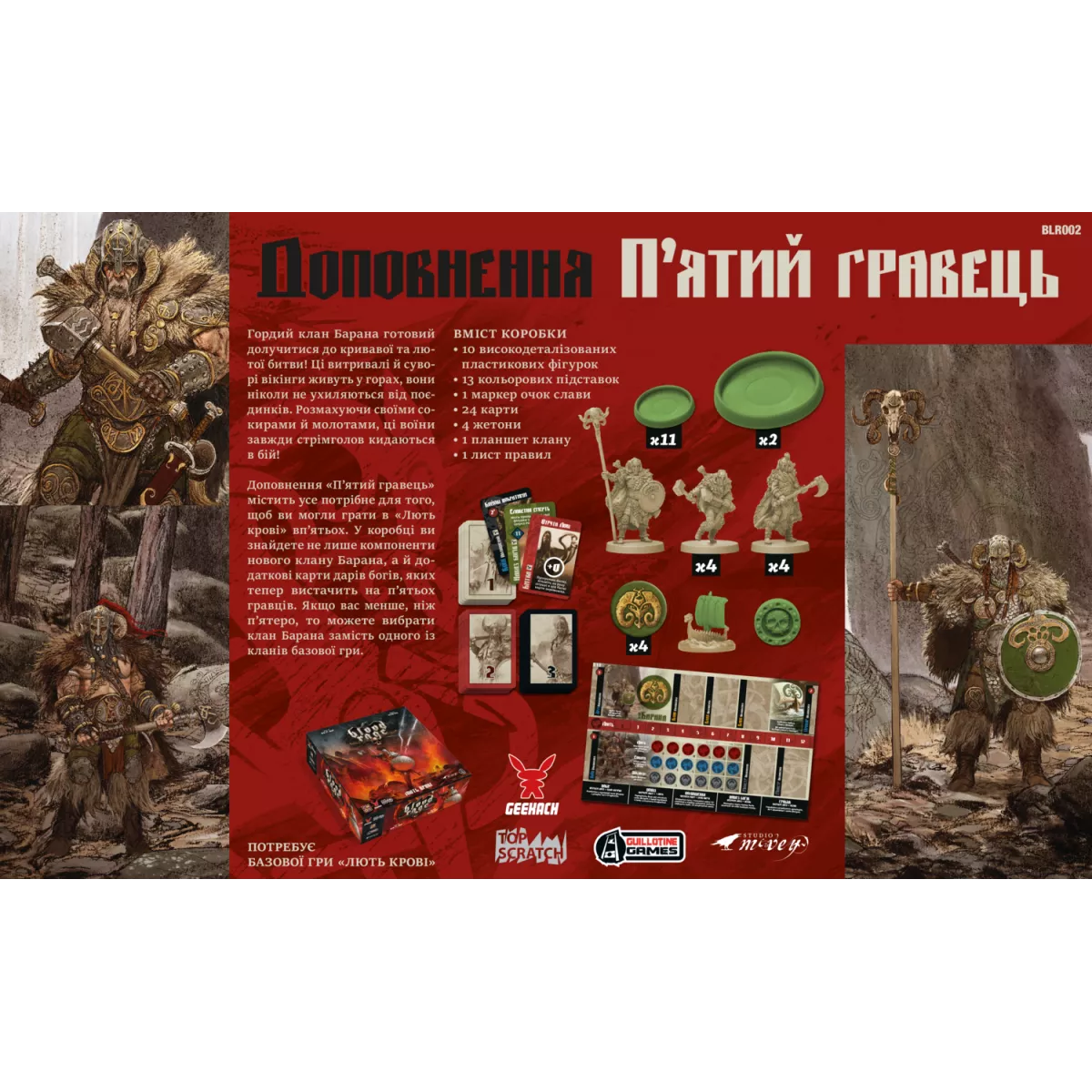 Доповнення «П’ятий гравець» містить усе потрібне для того, щоб ви могли грати в «Лють крові» вп’ятьох. У коробці ви знайдете не лише компоненти нового клану Барана, а й додаткові карти дарів богів, яких тепер вистачить на п’ятьох гравців. Якщо вас менше, ніж п’ятеро, то можете вибрати клан Барана замість одного із кланів базової гри.