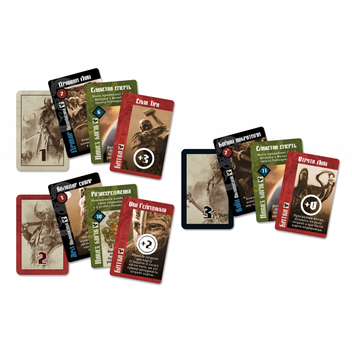 У коробці 10 високодеталізованих пластикових фігурок, 13 кольорових підставок, 1 маркер очок слави, 24 карти, 4 жетони, 1 планшет клану, 1 лист правил