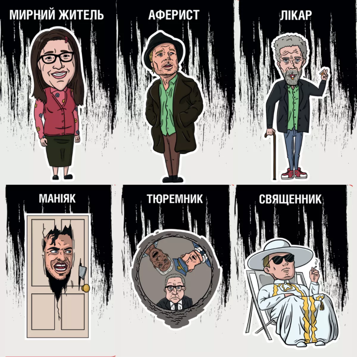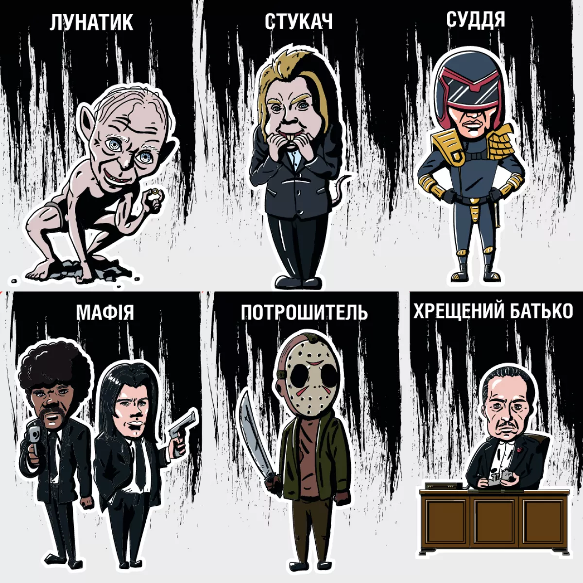 У коробці 30 карток ролей, 21 картка ведучого, правила гри