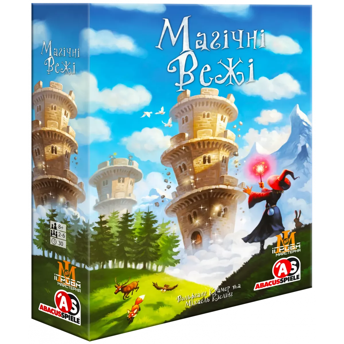 Настільна гра «Магічні вежі» запрошує учасників пробігти через смугу перешкод у вигляді об'ємних веж, що у цьому чарівному світі не стоять на місці! Ув'язнюйте чарівників суперників, досягайте чорного замку Вежу Ворона, стрибайте між вежами та літайте на них, щоб шляхом заповнити якомога більше колб магічними зіллями. Особливістю гри є об'ємні вежі, які ви будете ставити одна на одну та переміщати треком протягом партії.