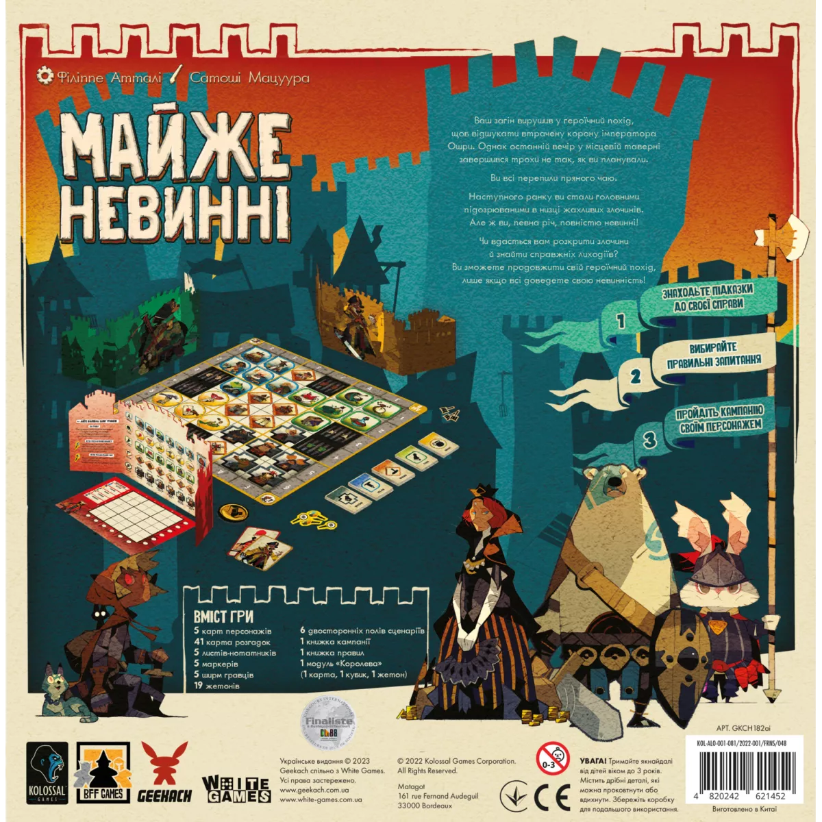 «Майже невинні» – це кооперативна гра на дедукцію: ставте влучні запитання, ведіть нотатки, використовуйте жетони розслідування і створюйте комбінації з карт розгадок у різних сценаріях, щоб розкрити злочини і врешті-решт довести свою невинність! Якщо ви є прихильником детективного жанру, Гікач також радить звернути увагу на гру «Детектив. Сучасне розслідування» і серію кооперативних ігор «Шерлок».