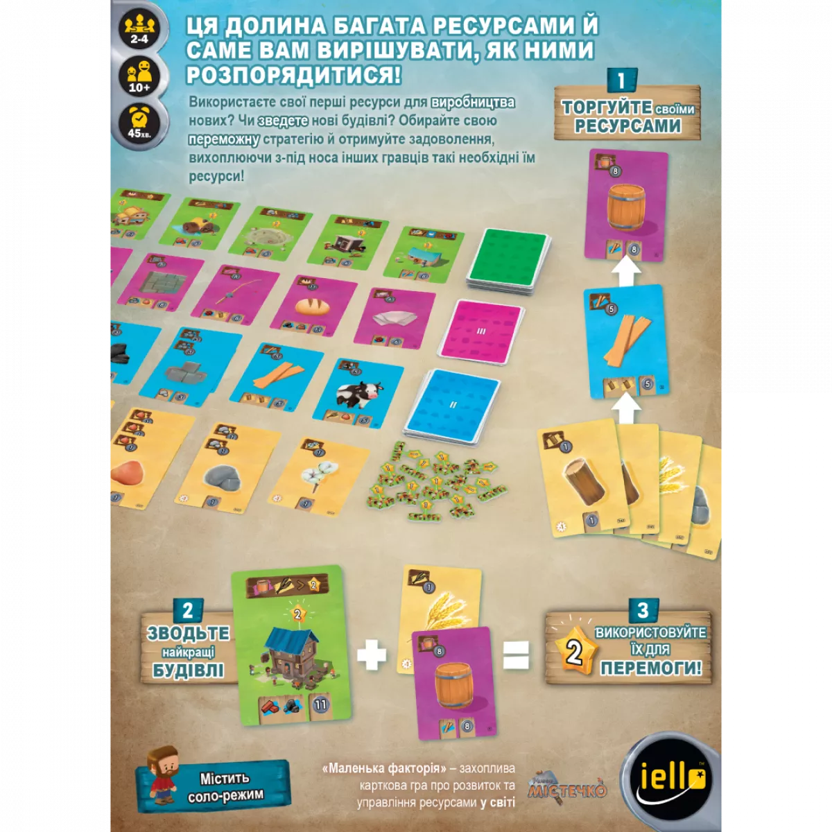 Будь-якому поселенню, навіть молодому. щойно збудованому Маленькому Містечку потрібне власне маленьке виробництво, аби виготовляти запашний хліб, розводити тварин, добувати ресурси та все більше й більше розвивати власні технології. Саме тому й було вирішено побудувати Маленьку Факторію! Маленька Факторія (Little Factory) це невеличка, але різноманітна сімейна карткова гра, у якій ви будете заробляти грошики, відкривати нові можливості та будувати власну факторію з виробництва всього-всього! Чим більше вкладено - тим більший прибуток. А чим більший прибуток – тим більше можна вкласти! Кожен гравець у свій хід може активувати кілька будівель і отримати їх ефекти. Але ж всі розуміють, що продати просто хліб не так вигідно, як м’ясний гуляш з хлібом, а замість звичайної вовни люди охоче придбають кольорові нитки для шиття. Тому мало просто отримати якісь ресурси, треба розумно ними розпоряджатися! Щоб здобути перемогу треба мати вплив на ринок Гроші – це, звичайно важливо, без них нікуди. Але одними грошима відомим не станеш, треба набувати престижу та отримувати повагу від колег по цеху! Час же вирости з маленької палатки на околицях ринку до цілої мережі магазинів. Хай вони і будуть невеликі, проте люди вже почнуть про вас говорити (сподіваємось, тільки щось приємне). Тож якщо вас цікавить проста карткова гра, що не займає багато місця ні на столі, ні на поличці, а її правила можна пояснити навіть новачкам за 5 хвилин, то настілочка Маленька Факторія точно стане вам у нагоді! А для повної автентичності цю фаторію слід будувати на околицях якогось мальовничого населеного пункту, як от наприклад того, який можна побудувати у грі Маленьке Містечко.