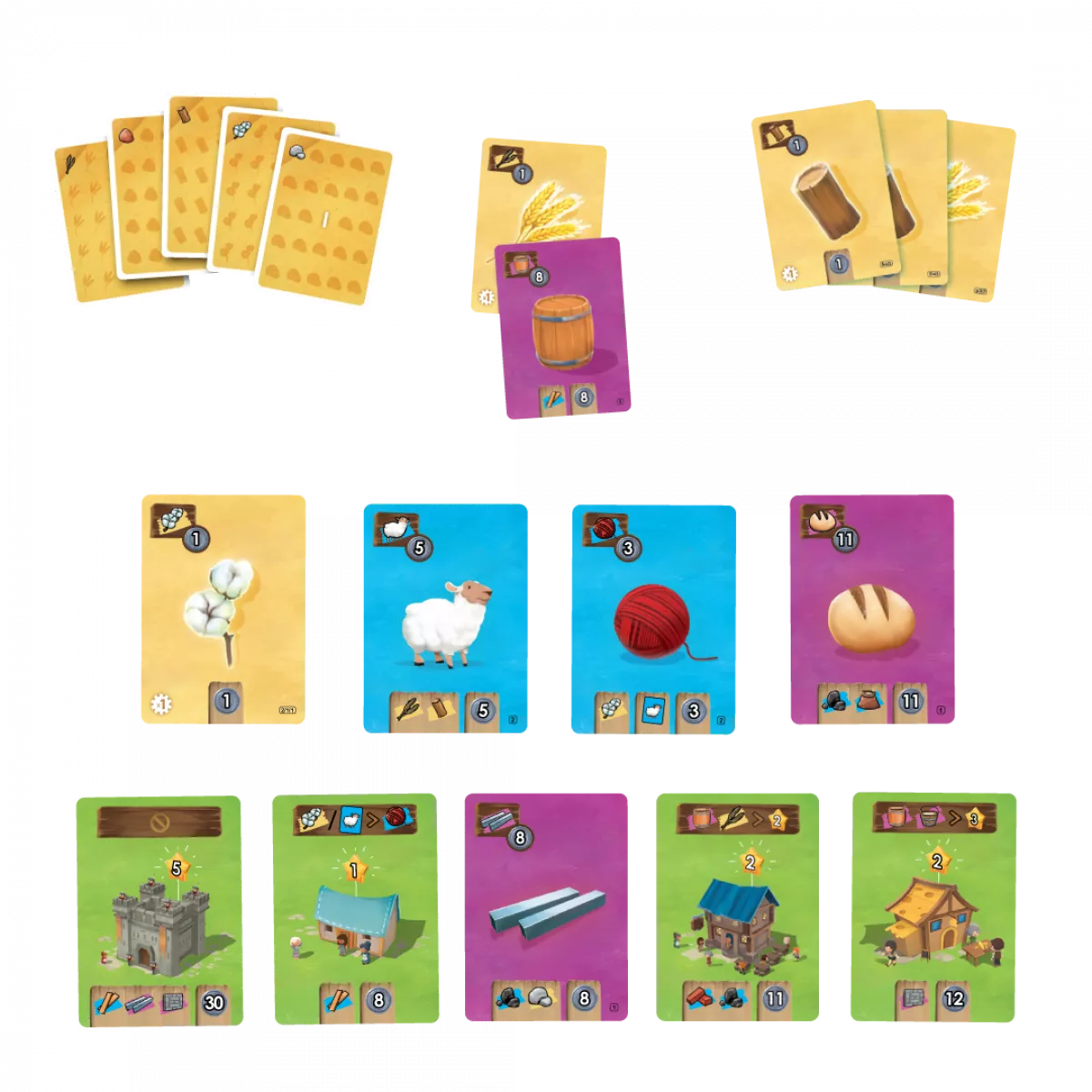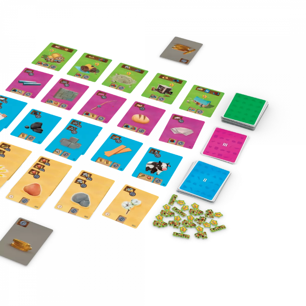 У коробці 44 карти ресурсів, 30 карт будівель, 12 жетонів впливу, 4 тайли стартових монет, правила