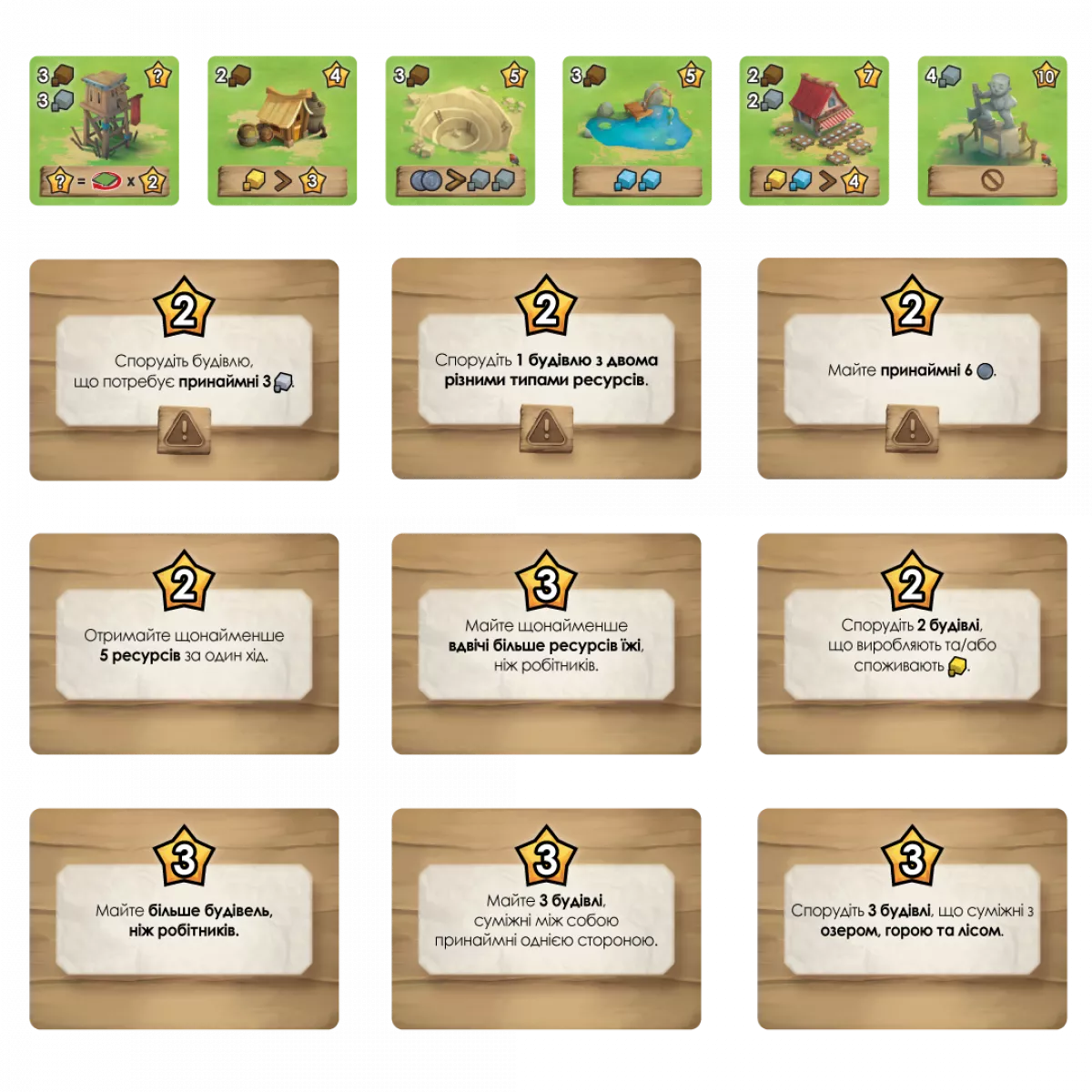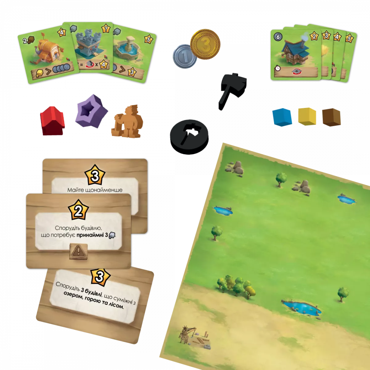 У коробці ігрове поле, 29 тайлів будівель, 18 карт цілей, 20 токенів робітників (по 5 білих, помаранчевих, червоних і фіолетових), 60 кубиків ресурсів (по 15 каменю, деревини, риби та пшениці), токен першого гравця, маркер раундів, 28 токенів будиночків (по 7 білих, помаранчевих, червоних і фіолетових), 24 монети (16 номіналом «1» і 8 номіналом «3»), 4 маркери номіналом «60», 4 маркери переможних балів, довідник