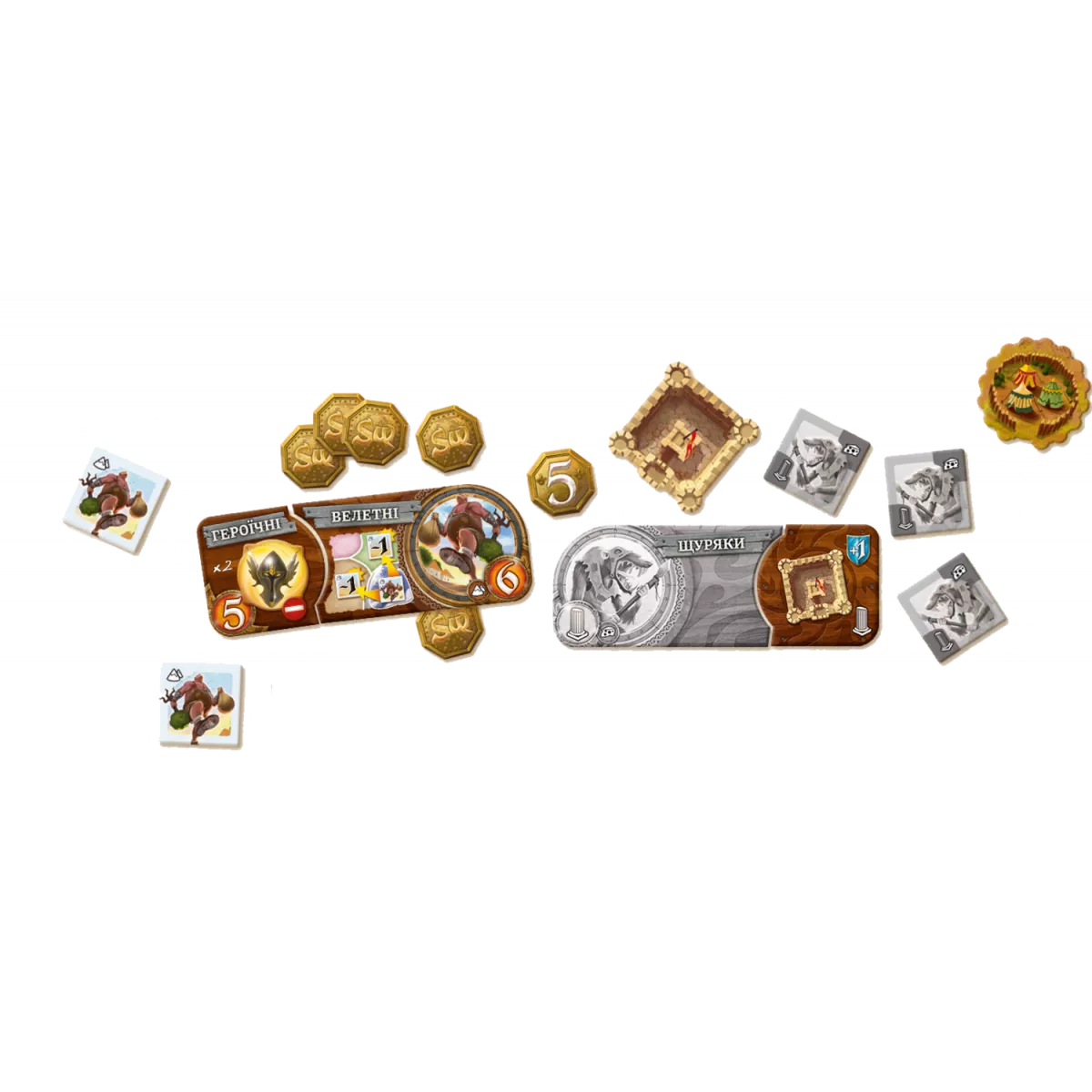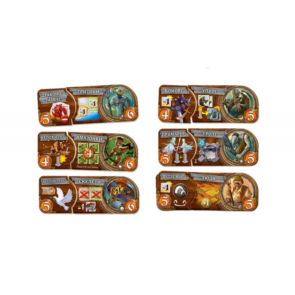 У коробці 2 двосторонніх ігрових поля (4 мапи), 6 пам'яток, 14 двосторонніх плиток рас, 1 порожня плитка раси, 168 жетонів рас, 18 жетонів загублених племен, 20 плиток властивостей, 1 порожня плитка властивості, 10 жетонів тролячих лігв, 6 жетонів фортець, 9 жетонів гір, 5 жетонів таборів, 2 жетона нори, 2 жетона героїв, 1 жетон дракона, 109 монет переможних очок, 1 особливий шестигранний кубик підкріплень, 1 маркер раунду, Додаток, Правила