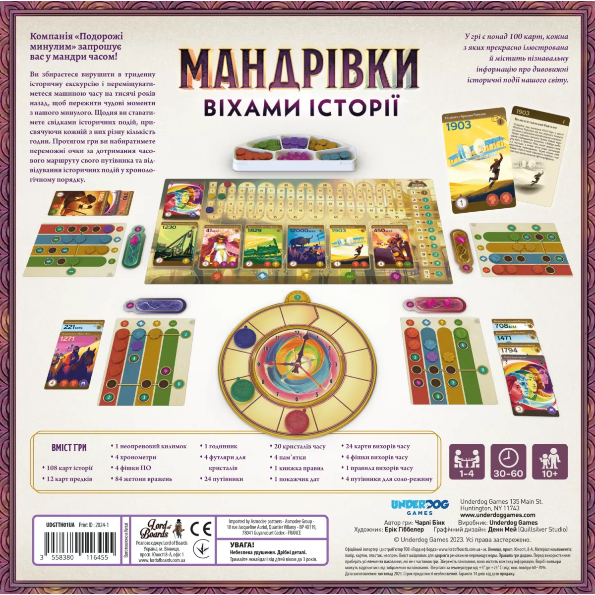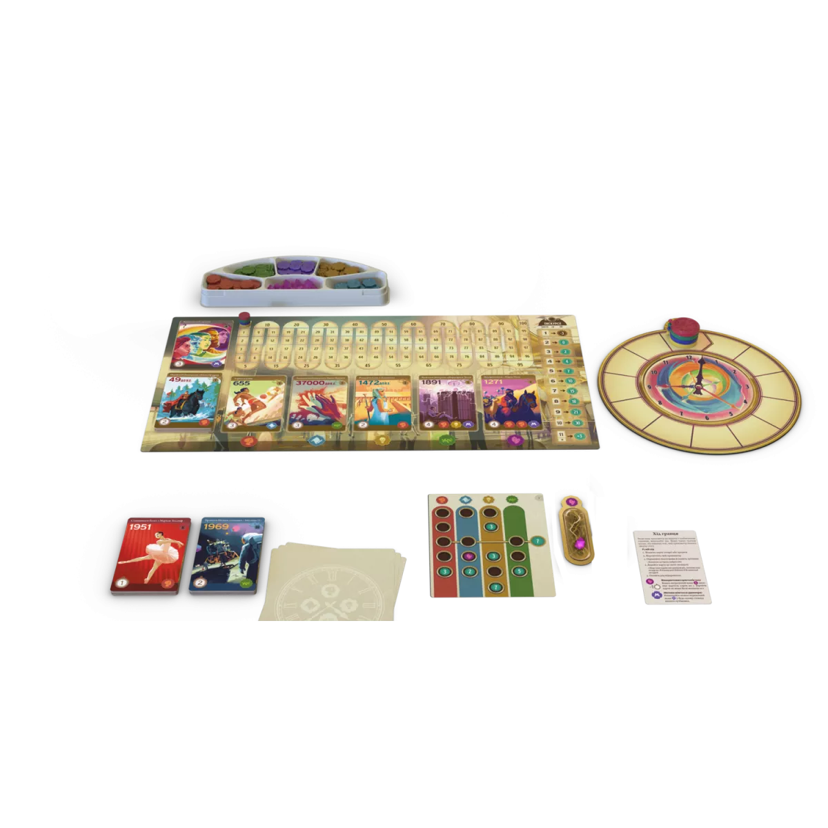 У коробці 108 карт історії, 12 карт предків, 1 планшет годинника, 1 неопреновий ігровий килимок, 4 фішки хронометрів, 4 фішки ПО, 84 жетони вражень (20 особистостей, 18 подій, 16 інновацій, 16 прогресу, 14 міжчасся), 20 кристалів часу, 4 футляри для кристалів, 24 путівники, 4 пам’ятки, 1 покажчик дат, 24 карти вихорів часу, 4 фішки вихорів часу, Правила, Правила модуля «Вихори часу», Правила соло-режиму