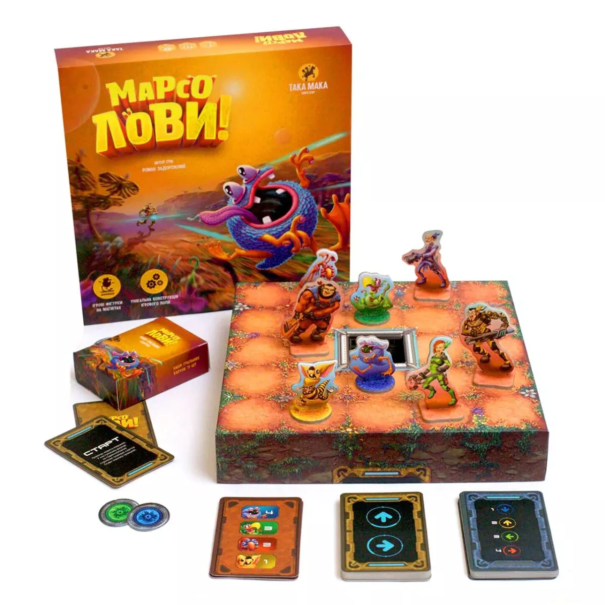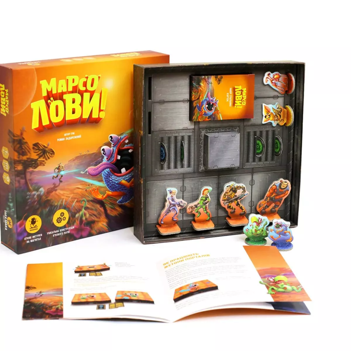 Ми так довго шукали інших розумних істот за межами нашої планети, а вони, як виявляється, зовсім поруч. Так, на Марсі спокійно собі існують маленькі та дещо лякливі марсозвірі. Так би хотілося з ними поспілкуватися та повивчати, щоби зрозуміти, як вони себе ведуть і що їм притаманно. Для цього потрібно їх піймати на їхній рідній планеті, після чого доставити на Землю. Завдання звучить нескладно, тільки ми ж говорили, що марсозвірі досить лякливі ‒ постійно тікають від вас по всьому Марсу. Єдиний варіант ‒ загнати їх у пастку в настільній грі Марсолови. Вони будуть бігати, але ви все-таки їх зумієте піймати, ми в вас віримо! Ми хочемо вас просто спіймати! Марсолови ‒ настільна гра для всієї сім'ї, у якій вам належить стратегічно розпланувати лови всіх марсозвірів. У кожного гравця буде індивідуальне завдання, яке дає переможні очки за правильний порядок їх потрапляння до пастки. У кожному раунді гравцям належить розігрувати карти руху своїх марсоловів, щоби загнати до пастки потрібних їм марсозвірів. У кожного своя ціль, так що тут ще потрібно постаратися її досягти раніше за інших. У раунді на вас очікує декілька фаз. Усе починається з розкриття карти руху марсозвірів, щоби учасники знали їхні плани. Далі кожен гравець розігрує по одній карті свого руху з руки, щоби бути ближчими до своїх цілей, після чого потрібно добрати карти до трьох. Після цього рухаються самі Марсозвірі, дотримуючись деяких правил. Через свій рух вони можуть потрапити до пастки, а якщо зіткнуться із іншим створінням ‒ підсунуть і його в тому ж напрямку. Найвеселіше відбувається, коли інопланетянин має ступити на місце марсолова ‒ у такому випадку він навпаки тікає, роблячи крок у зворотному напрямку. Якщо ж сам марсолов приходить на місце марсозвіра, то він ставить його на будь-яку сусідню клітинку. Настільна гра Марсолови триває до того моменту, поки всі істоти не потраплять до пастки. Підрахуйте бали та визначте переможця цього маленького марсіанського полювання. Марсозвірів спіймають тільки справжні професіонали Марсолови ‒ нескладна настільна гра, яка змусить вас планувати свої дії наперед, адже ви завжди знатимете, що робитимуть ці маленькі інопланетяни. Ігровий процес проходить доволі просто, і головне, що всім весело!
