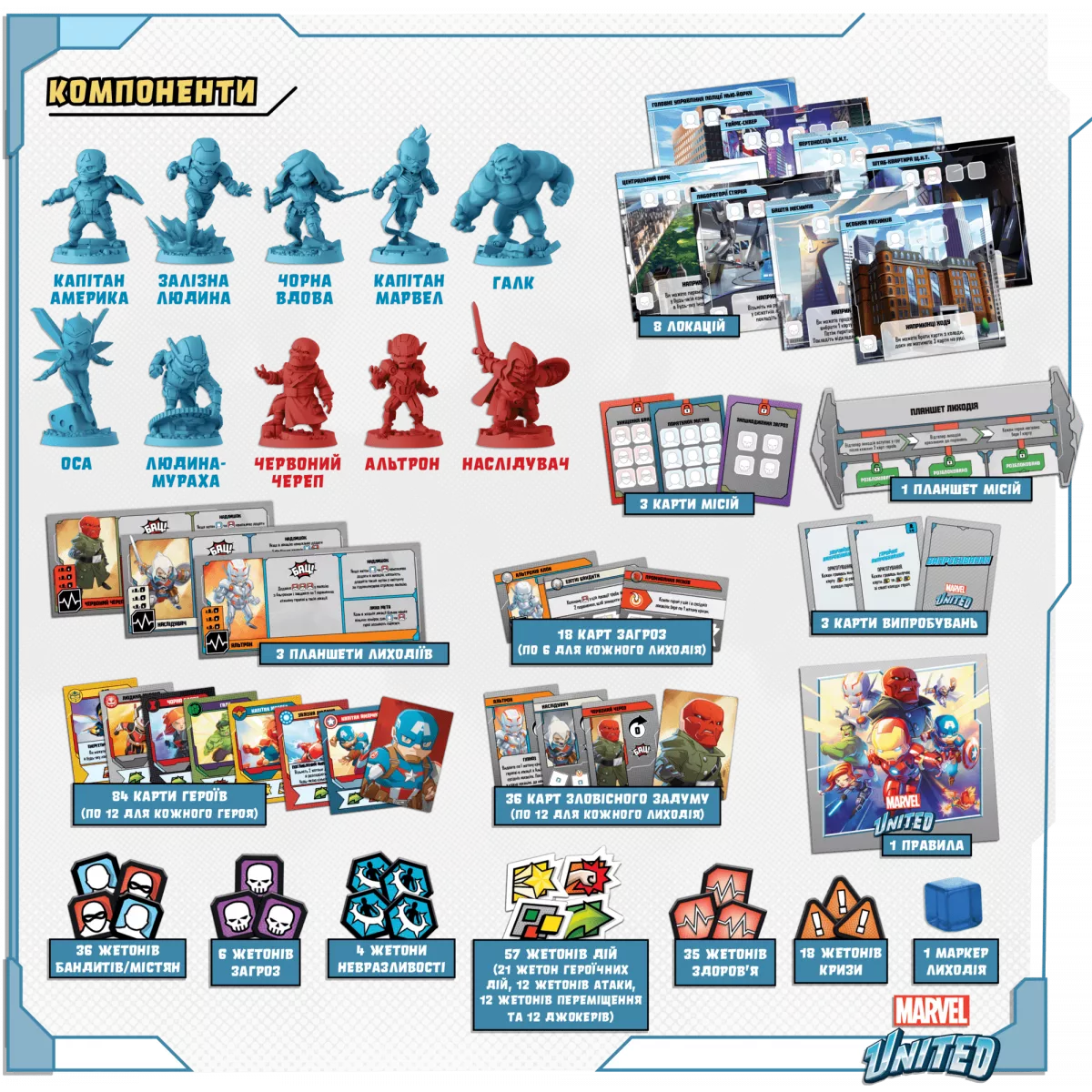 У коробці 7 фігурок героїв, 3 фігурки лиходіїв, 84 карти героїв, 3 планшети лиходіїв, 36 карт зловісного задуму, 18 карт загроз, 8 локацій, 1 планшет місій, 3 карти місій, 3 карти випробувань, 156 жетонів, 1 маркер лиходія, 1 книжка правил