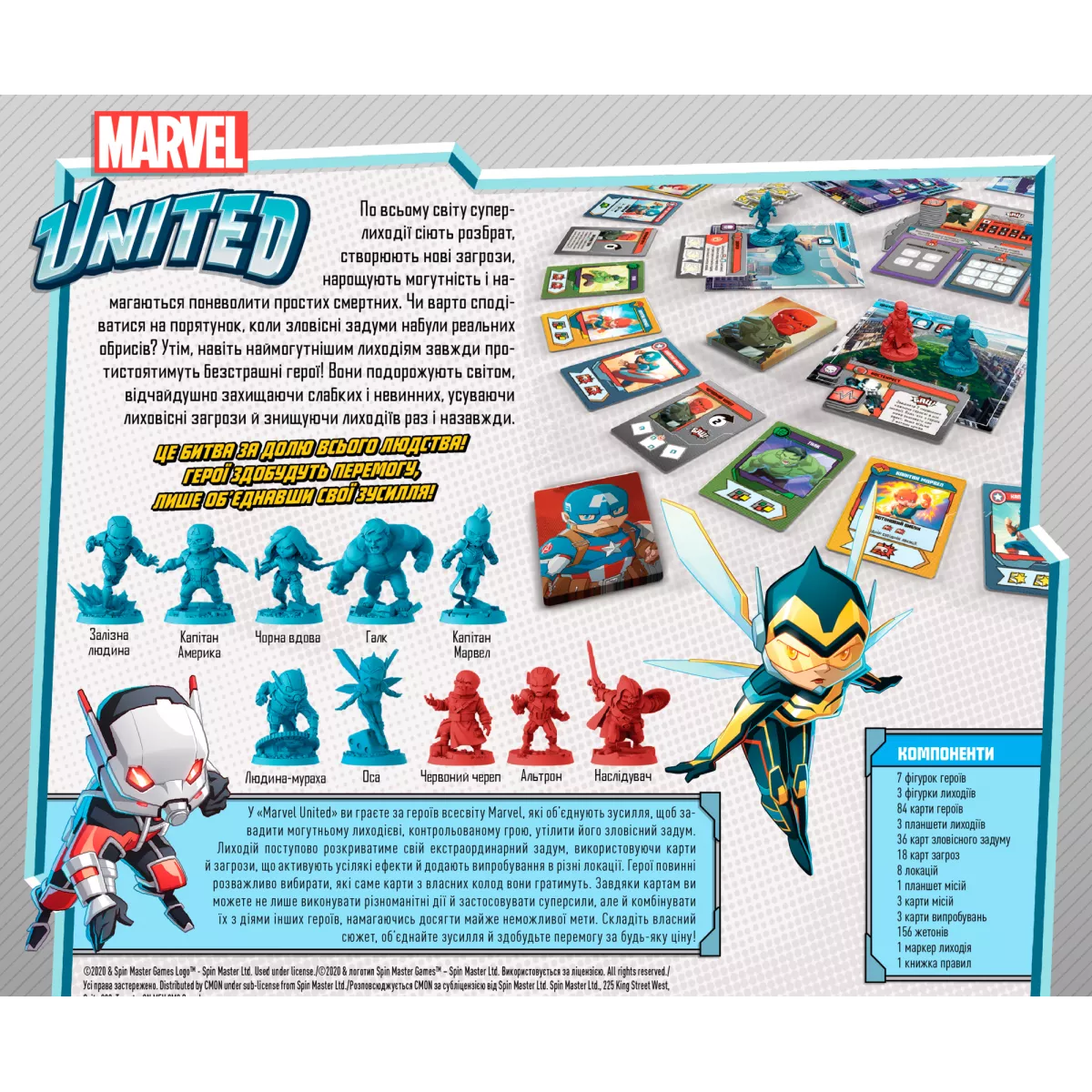 У Marvel United ви берете на себе роль легендарних героїв Marvel, які співпрацюють, щоб зупинити генеральний план могутнього лиходія, яким керує гра. Кожен лиходій розкриває свій унікальний генеральний план із картками, які викликають різні ефекти, і загрозами, які створюють виклики на різних локаціях. Герої повинні ретельно вибирати карти для гри зі своїх унікальних колод, які не тільки пропонують різні дії та надздібності для використання, але й поєднуються з діями інших Героїв, щоб зробити неможливе. Побудуйте свою сюжетну лінію, об'єднайте свої сили, врятуйте ситуацію!