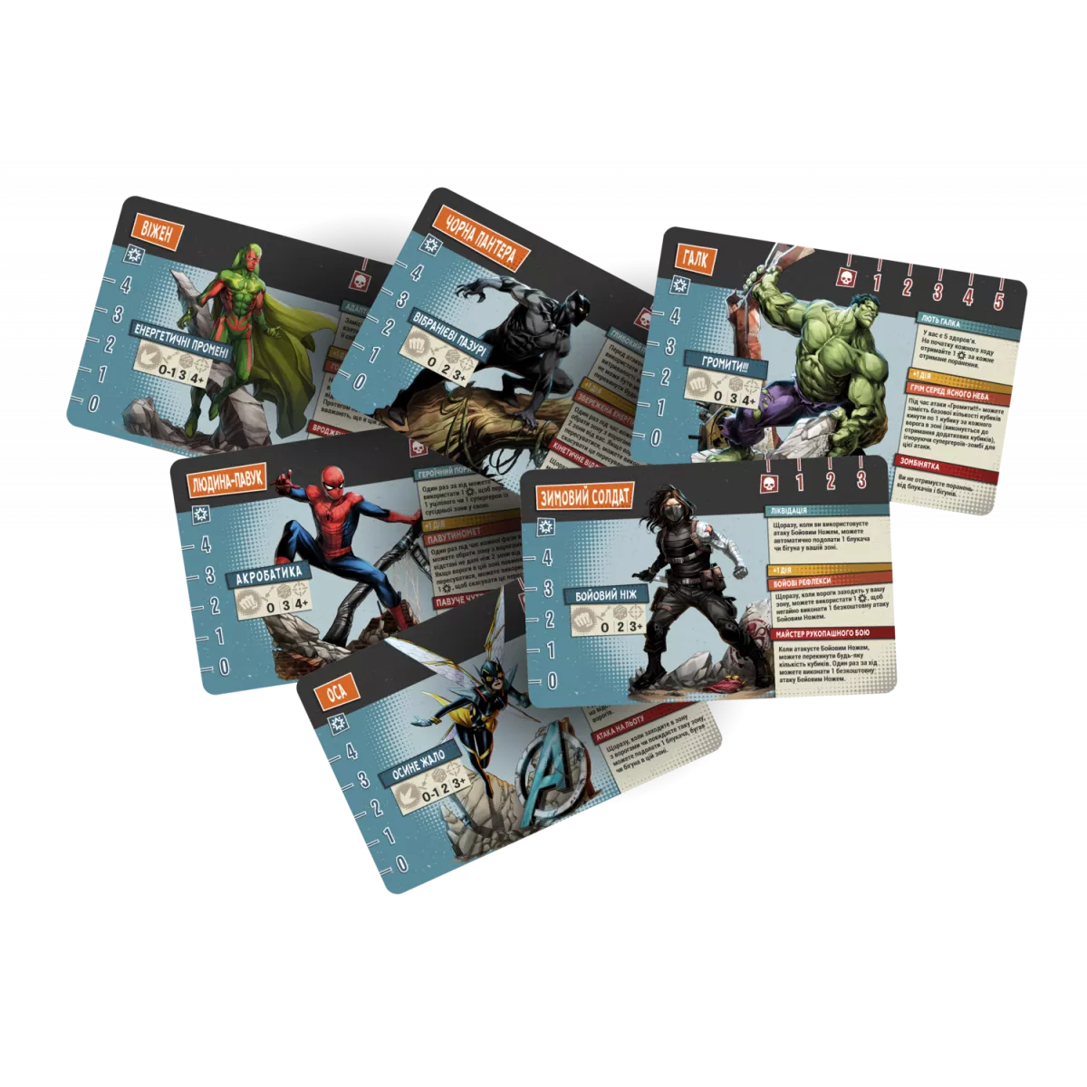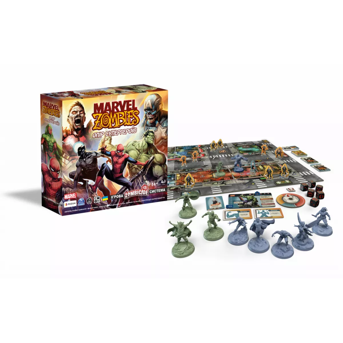 Під час зомбі апокаліпсису людство може бути спокійне, адже їх захищають могутні супергерої, в тому числі Месники! Але ж стривайте… Невже Тоні Старк, Багряна відьма, Доктор Стрендж та Капітан Америка теж потрапили під вплив вірусу? Тепер уцілілим героям необхідно докласти всіх зусиль, аби людство вистояло! Настілочка Marvel Zombies: Опір Супергероїв - це кооперативна пригодницька гра у сеттінгу відомого Зомбіциду для компанії до 4 гравців, яким разом доведеться подолати близько 10 сюжетних місій, кожна з яких матиме власну мету, перешкоди та умову перемоги. Живі мерці повсюди! Якщо ви знайомі з грою Зомбіцид, то основні механіки будуть вам зрозумілі. Якщо ж ви це слово чуєте вперше, то основна фішка гри - це ЗОМБІ! Їх десятки, вони швидкі та сильні, тому вашим героям необхідно виконувати свої дії разом, аби захистити мирних містян та впоратись з супергероями-зомбі. Навіть під час катастрофи треба ставати кращим! Кожна перемога над ворогом зробить вашого героя сильніше, проте Людина-Павук не стане користуватись автоматом, авжеж. А от навчитися нових фішок, аби боротися з мерцями ще ефективніше, – це з радістю! Та чим потужніші ви будете, тим більш ласим обідом для зомбі ви станете, тож будьте обережні! Оскільки доля світу залежить лише від уцілілих героїв, загибель навіть одного з них призведе до катастрофи і програшу у грі, тому допомагайте один одному, прикривайте спини та досягайте спільної мети усіма можливими способами! Тож якщо ви фанатієте від гри Зомбіцид, але часу на великі партії не завжди вистачає, або ж ви досі вагалися чи варто брати велику коробочку з грою Зомбіцид – просто почніть з гри Marvel Zombies: Опір Супергероїв, яка познайомить нових гравців із базовими механіками, а вже досвідченим борцям із зомбі дасть змогу зіграти партію набагато швидше. Проте не забувайте, що культовий Зомбіцид вийшов у другій редакції, що додає ще більше зброї, зомбі та сюжетних завдань, у яких можна знищувати мерців десятками різних способів!