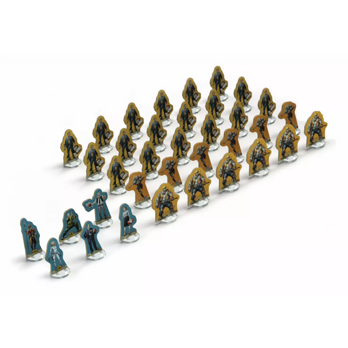 У коробці 6 мініатюр супергероїв, 4 мініатюри супергероїв-зомбі, 6 жетонів уцілілих, 50 жетонів зомбі, 4 кольорові підставки, 8 кліпс, 4 лічильники досвіду, 6 кубиків, 4 двосторонні фрагменти поля, 6 ID-карток, 71 карта, 27 жетонів, 1 книга правил