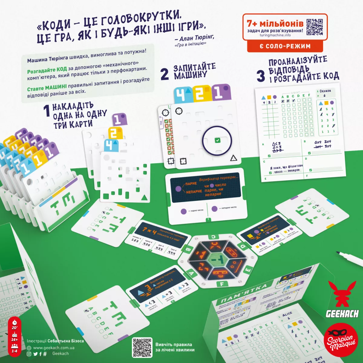 Машина Тюрінга це поняття, яке описує обчислювальну машину, суть якої полягає у опрацюванні рядів простих логічних операцій у пошуку відповіді. Вигадав же це поняття сам Алан Тюрінг, людина, яка розшифрувала код всесвітньовідомої Енігми – складної шифрувальної машини часів Другої світової. Машина Тюрінга (Turing Machine), яку ми розглядаємо зараз, це логічна гра для 1-4 любителів математики, основна ідея якої – розшифрування коду, використовуючи логічні підказки. У певний момент часу може здатися, наче ви справді розшифровуєте військові коди Ця настілка справді непроста і підійде саме для тих людей, хто не боїться концентруватися і думати, робити висновки, а не сподіватися на вдачу. Спершу для партії генерується код (вказаний у правилах, або мобільному додатку). Цей код гравцям необхідно відгадати, складаючи комбінації чисел, за кожне з яких відповідає окрема перфокарта (картка з великою кількістю отворів). Ці отвори розташовані таким чином, що накладаючись один на одного наскрізною буде лише одна комірка. І от саме в ній буде Хрестик або Галочка, які і є відповіддю на питання, яке ви задаєте машині (Чи більша третя цифра числа  за другу, чи сума цифр парна, чи є дві однакові цифри у відповіді і ще десятки варіантів запитів). І вашою метою є не «Отримання галочки», а правильне оперування цією інформацією, адже негативна відповідь – це теж відповідь! Багато ігор залишаються різноманітними впродовж десятку чи навіть сотні партій… Але цей випадок трошки інший Хоч в правилах гри записані всього пара десятків завдань, мобільний додаток для гри щоразу генерує випадкові комбінації умов, підказок та змінних, завдяки чому різних вихідних даних та рішень у грі буквально кілька мільйонів! Тож якщо ви не боїтеся математичних викликів, готові перевіряти свою логіку та раціональність мислення, а потім ще й робити коректні висновки з усіх отриманих записів – обов’язково придбайте коробку з грою Машина Тюрінга. Якщо ж ви полюбляєте задачі на дедукцію, проте не у математичному просторі, а в космічному – спробуйте знайти міфічну планету на небосхилі у грі The Search for Planet X.