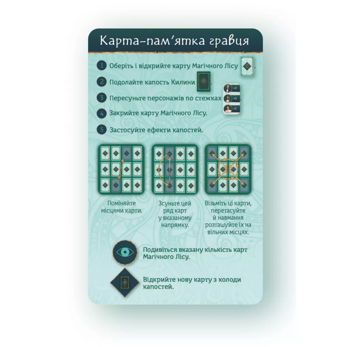 У коробці Планшет Магічного Лісу, Планшет Килини, 10 карт капостей Килини, 5 карт-пам'яток гравців, 12 карт Магічного Лісу, 3 фігурки персонажів, Правила гри