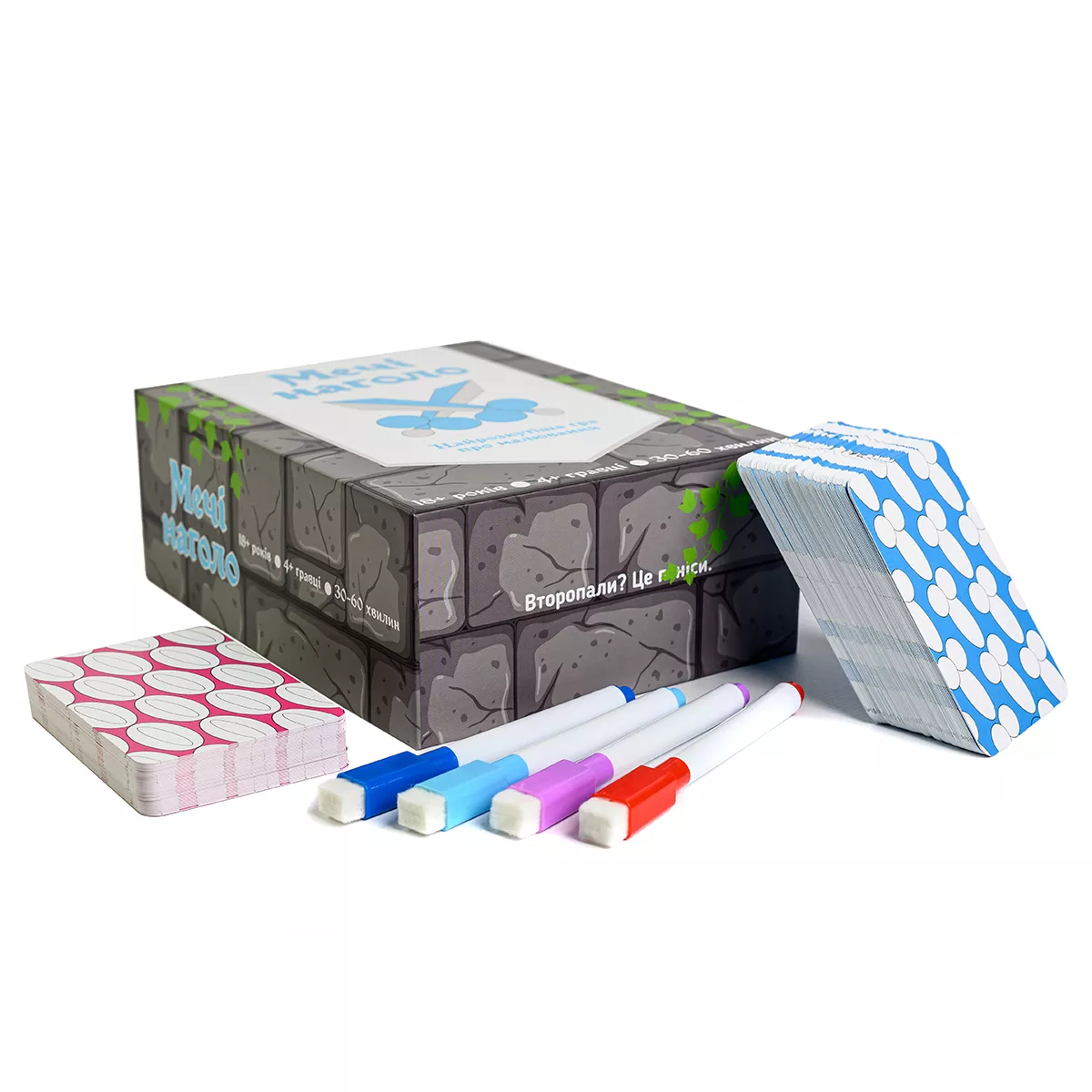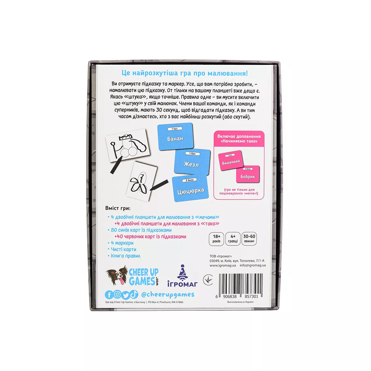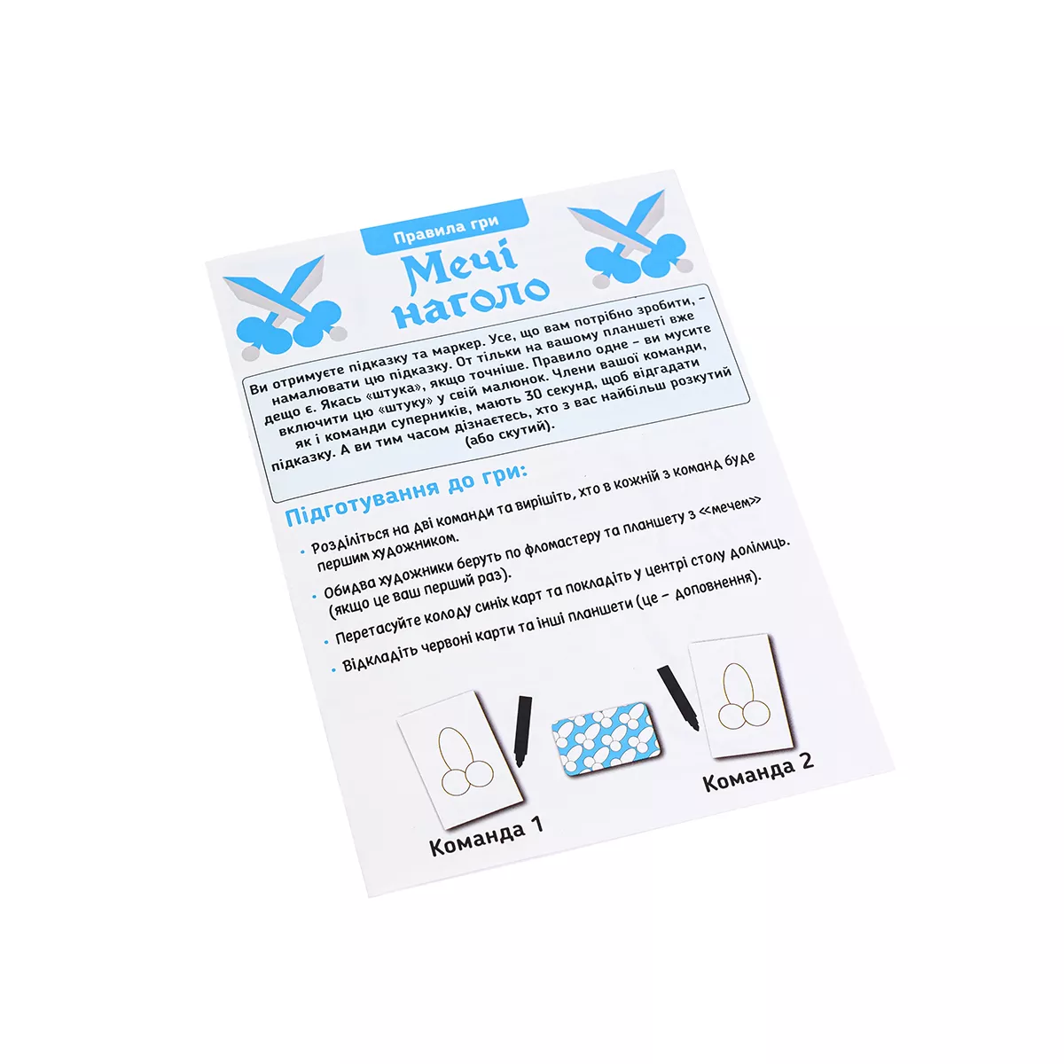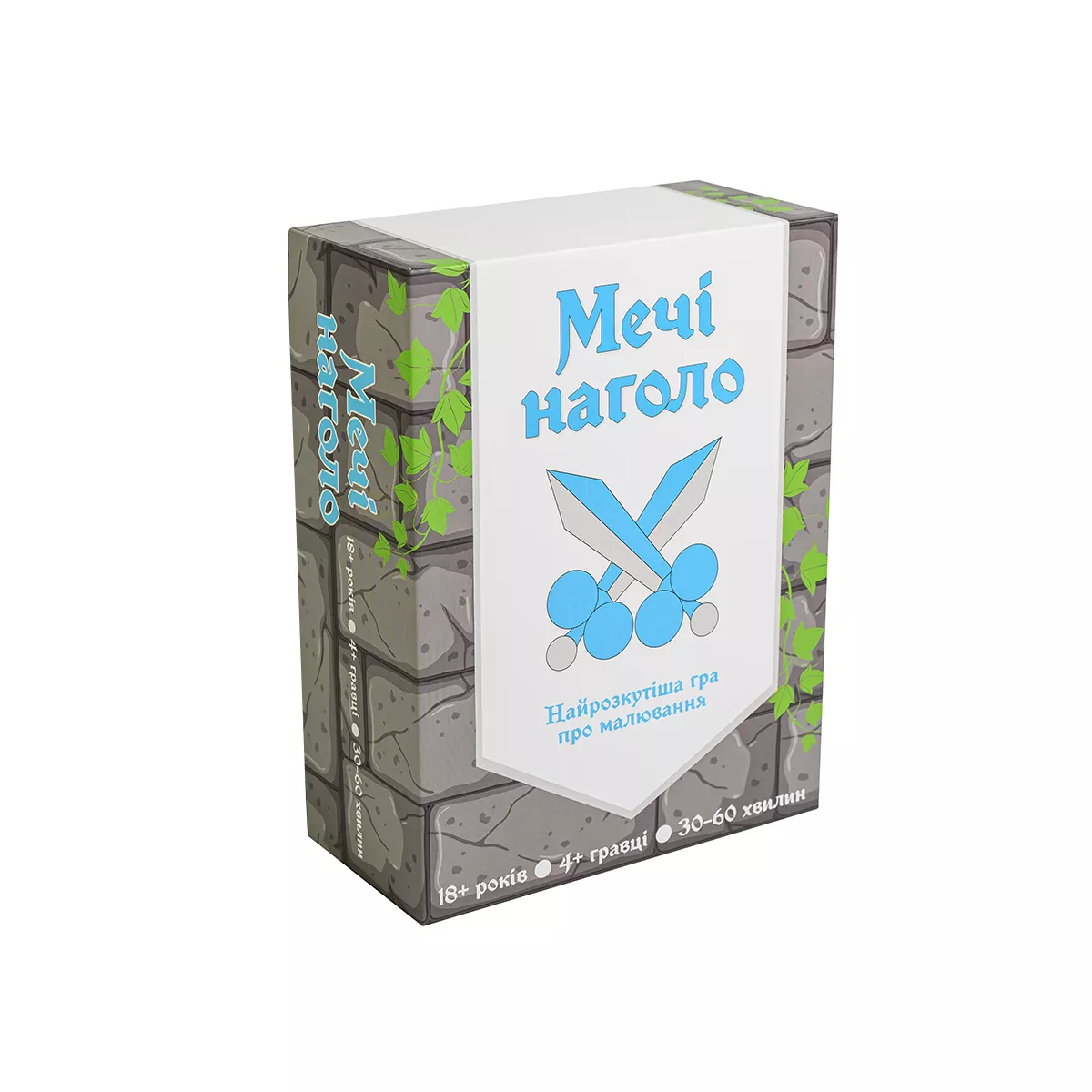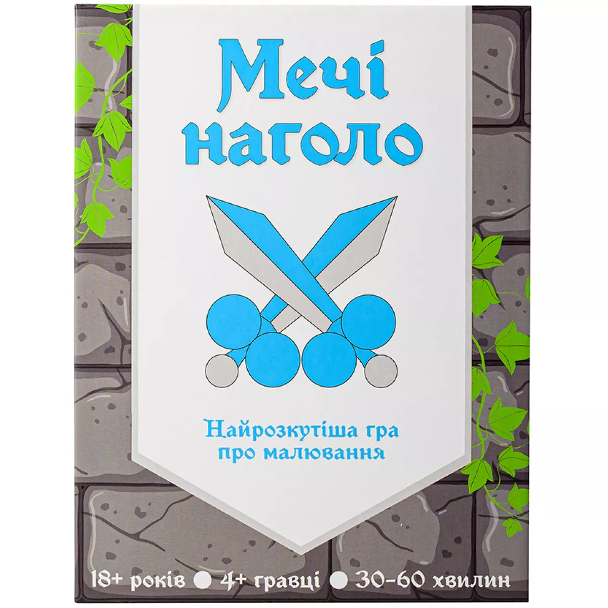 «Мечі наголо» – це динамічна гра на асоціації, ідеальна для дорослих вечірок. Вам знадобляться лише планшет, маркер і трохи фантазії. Використайте підказку, але не забудьте включити в композицію основу вашого малюнка – деяку «штуку». Адаптуйтесь, вигадуйте, жартуйте, будьте оригінальними та розслабтеся – тут не існує табу!