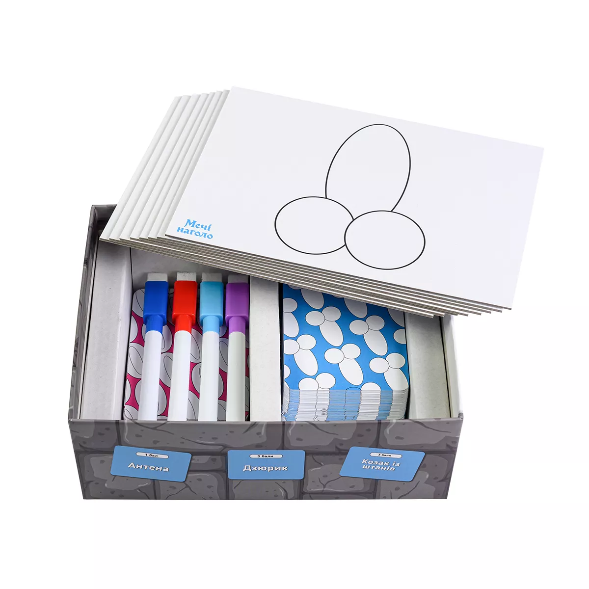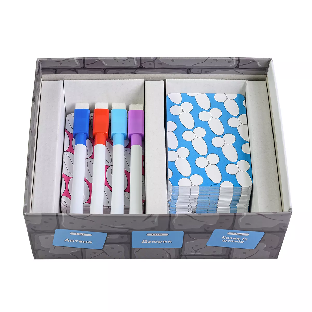 У коробці 4 двобічні планшети для малювання з «мечами», 80 синіх карт із підказками, 4 маркери, чисті карти, доповнення «Начиняємо тако» (4 двобічні планшети для малювання та 40 червоних карт із підказками), правила гри