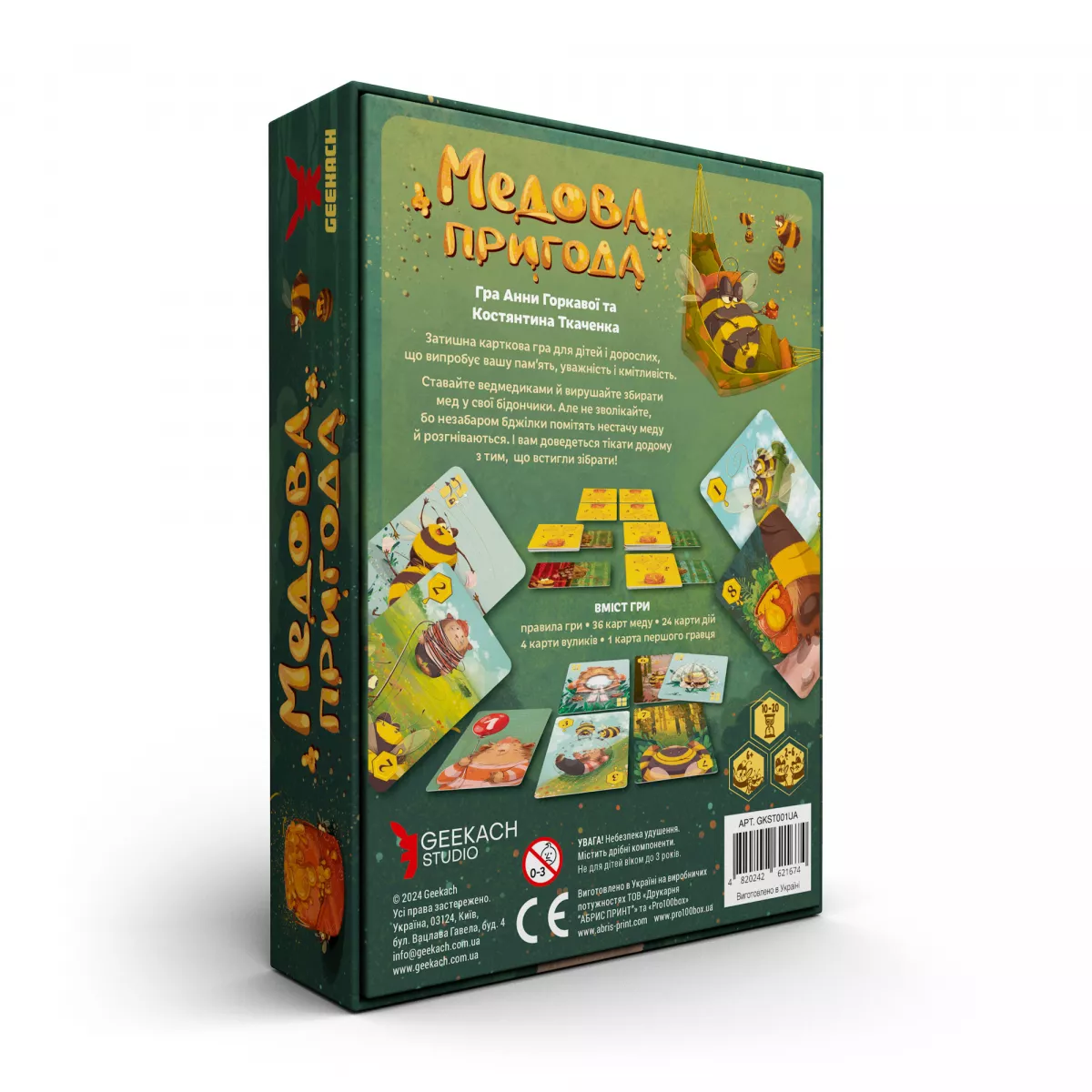 «Медова пригода» – це затишна карткова гра для дітей і дорослих, у якій гравці в ролі ведмедиків вирушать квітучим полем у медовий ліс. Ведмедики, звісно, найбільше за все люблять поласувати солодким медом, проте його охороняють старанні бджоли-працівниці. А втім… кого це зупинить?