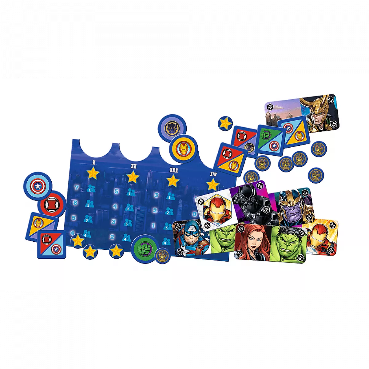 У коробці 5 жетонів Месників, 14 фішок із Таносом, 10 жетонів ідентичності, 4 бонусні фішки, стартова плиточка, двостороння дошка допомоги та для підрахунків, 60 плиточок Месників