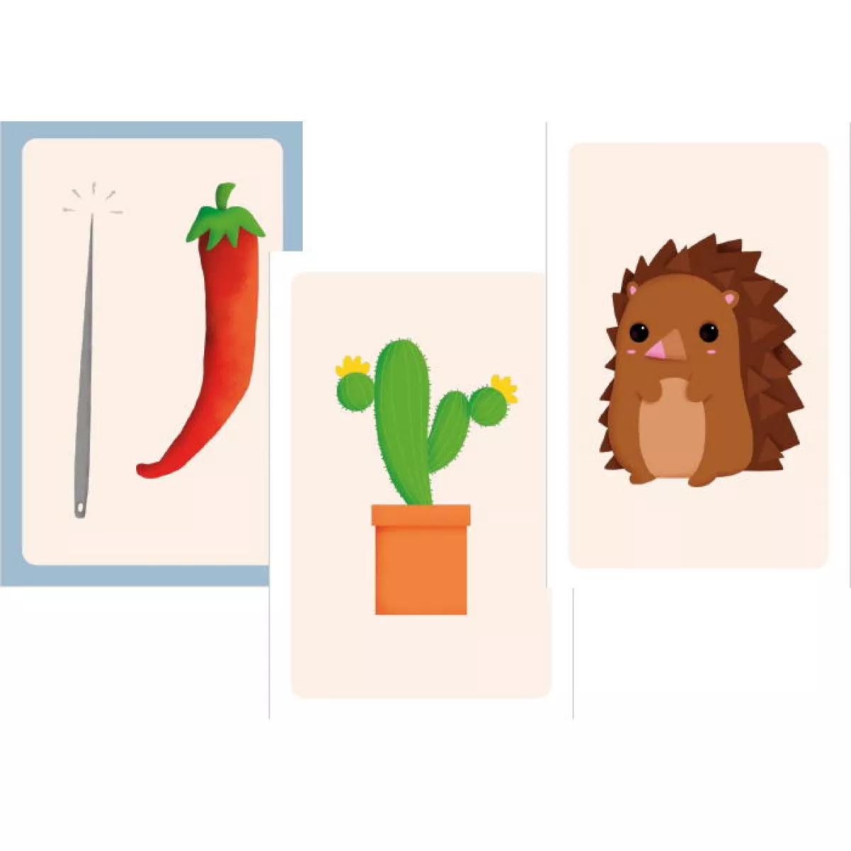 В наборі картки з зображенням предметів (кактус, шкарпетка, їжак тощо) з однієї сторони, та їх ознак (круглий, гарячий, гострий тощо) - з іншої. Кожен гравець отримує по 5 випадкових карт і викладає їх перед собою стороною з об'єктами догори. В центрі столу розміщується одна випадкова карта стороною з ознакою догори - це активна карта.