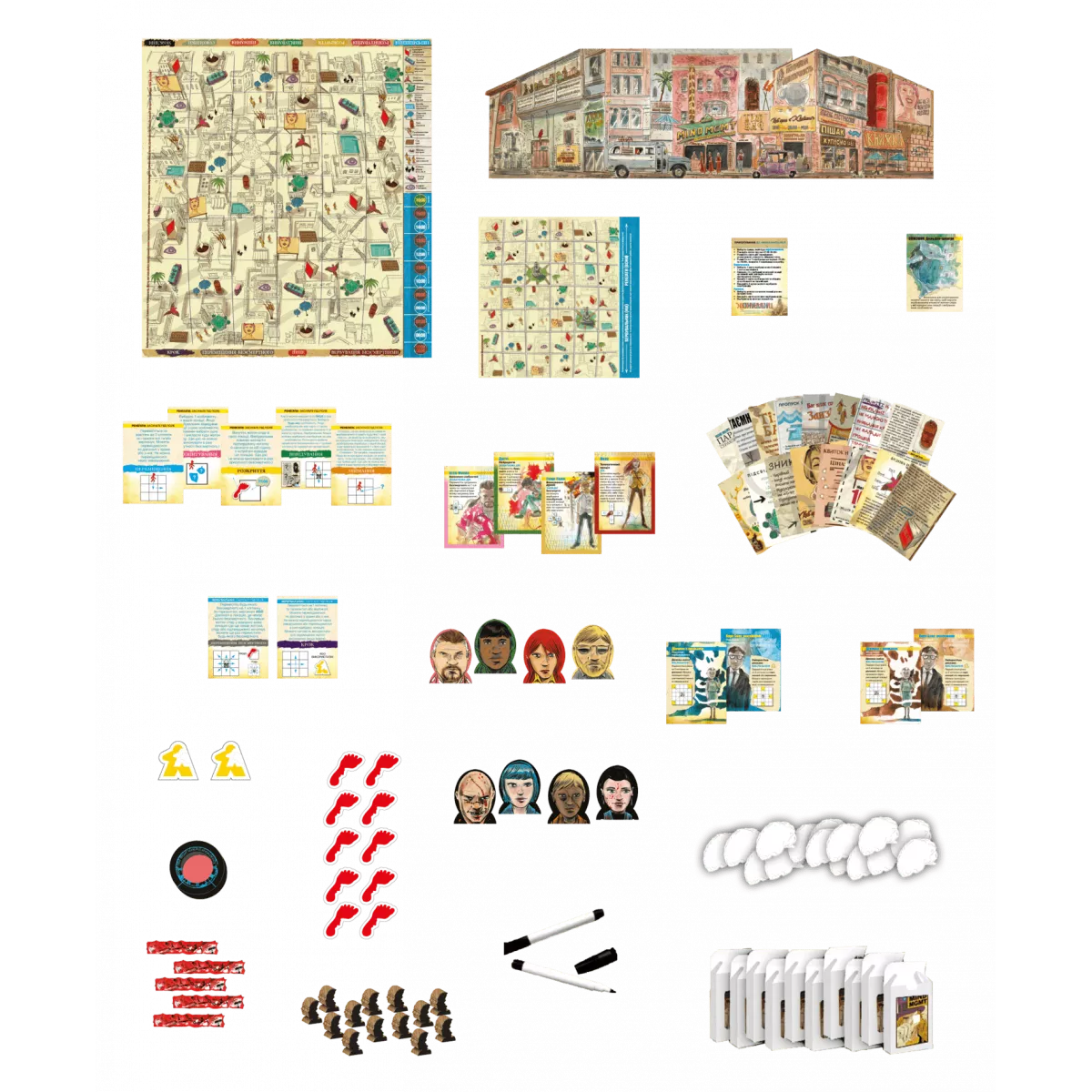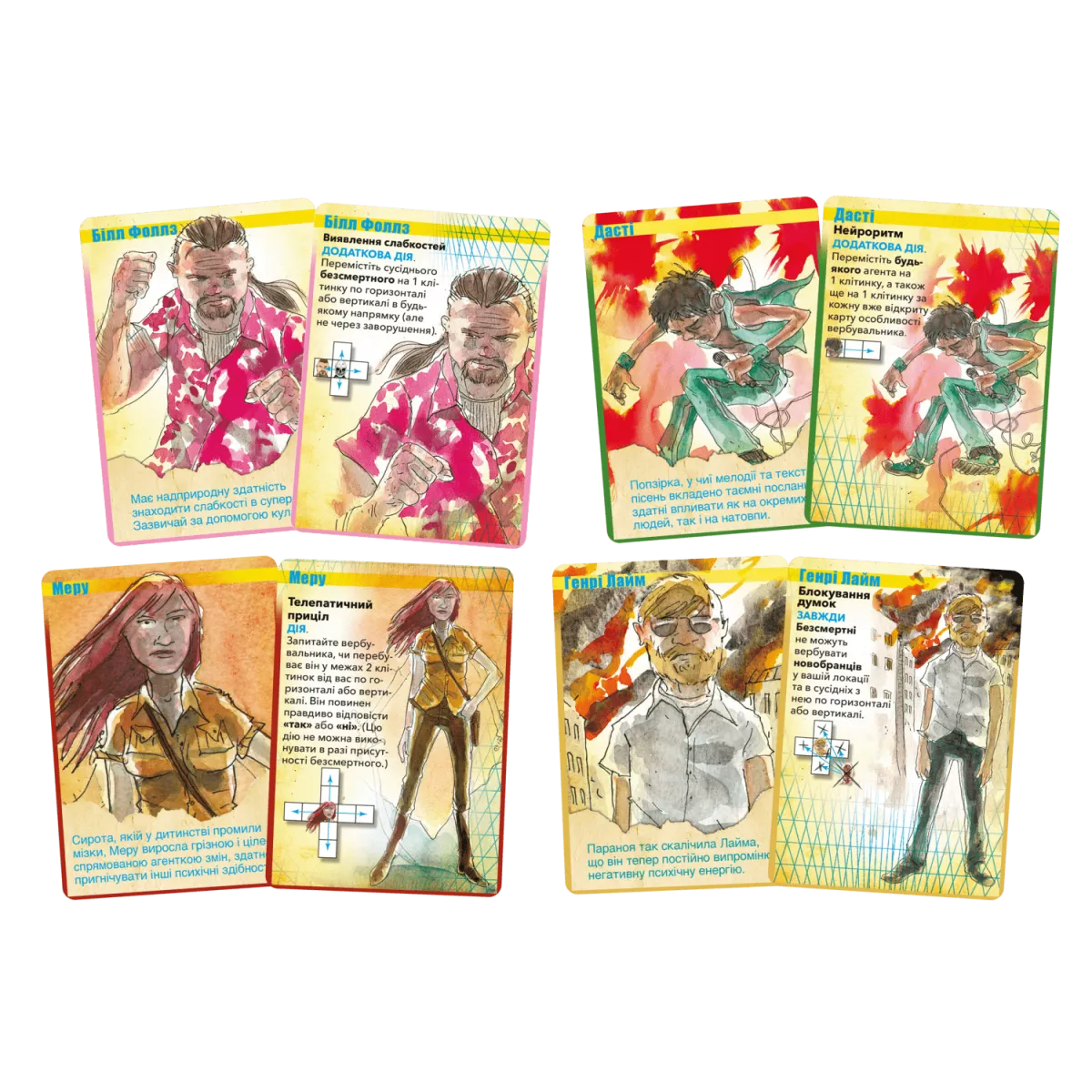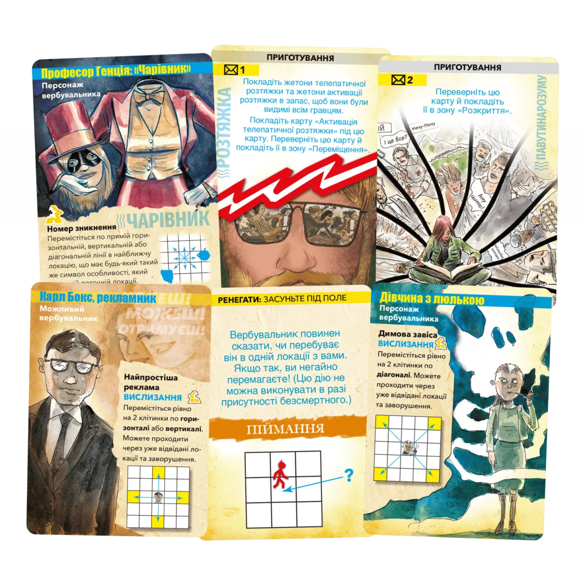 У коробці 1 ігрове поле, 5 карт дій ренегатів, 2 карти дій вербувальника, 1 ширма розуму, 1 таємна мапа, 1 двостороння пам’ятка з приготувань, 1 карта союзника, 4 двосторонні карти агентів, 16 карт особливостей, 4 фігурки агентів, 4 фігурки безсмертних, 2 карти вербувальників, 2 карти можливих вербувальників, 15 жетонів нотаток, 14 наборів балансу, 2 маркери, 2 жетони вислизання, 10 жетонів слідів, 1 жетон часу, 5 жетонів заворушень, 12 фішок новобранців