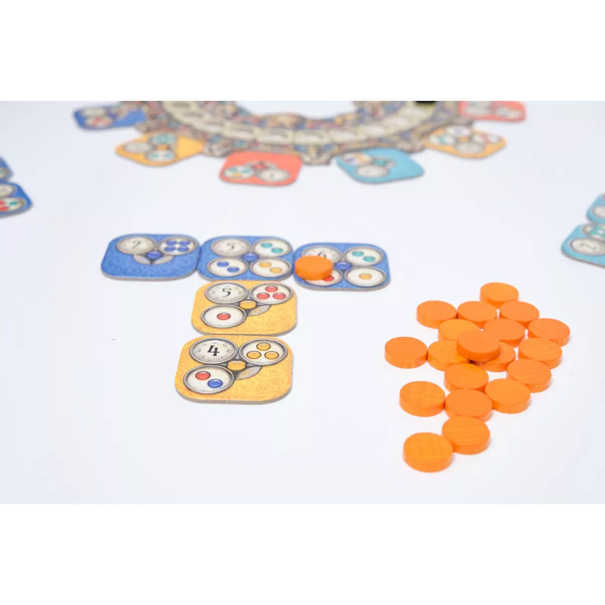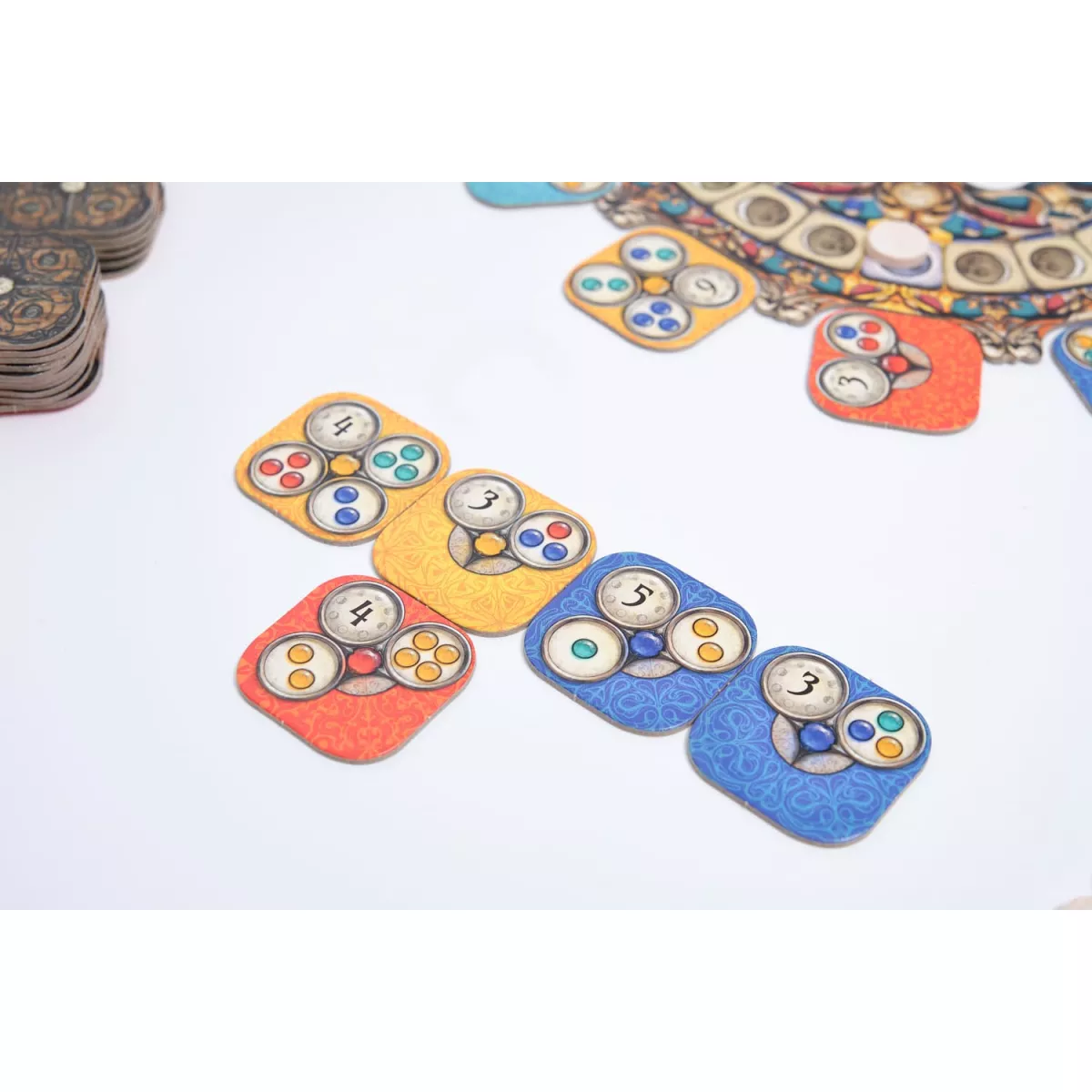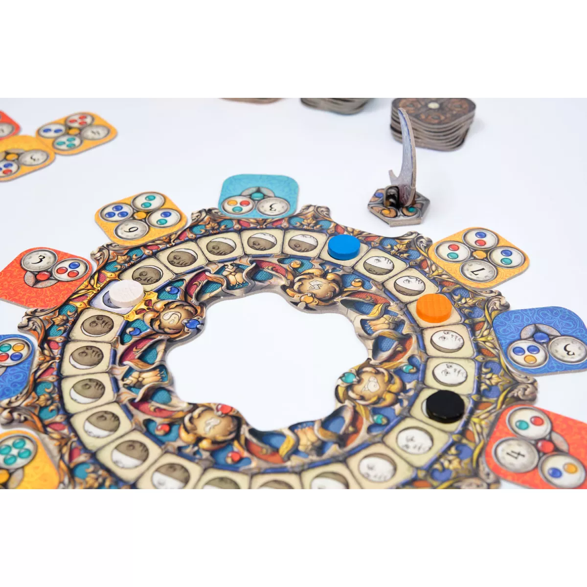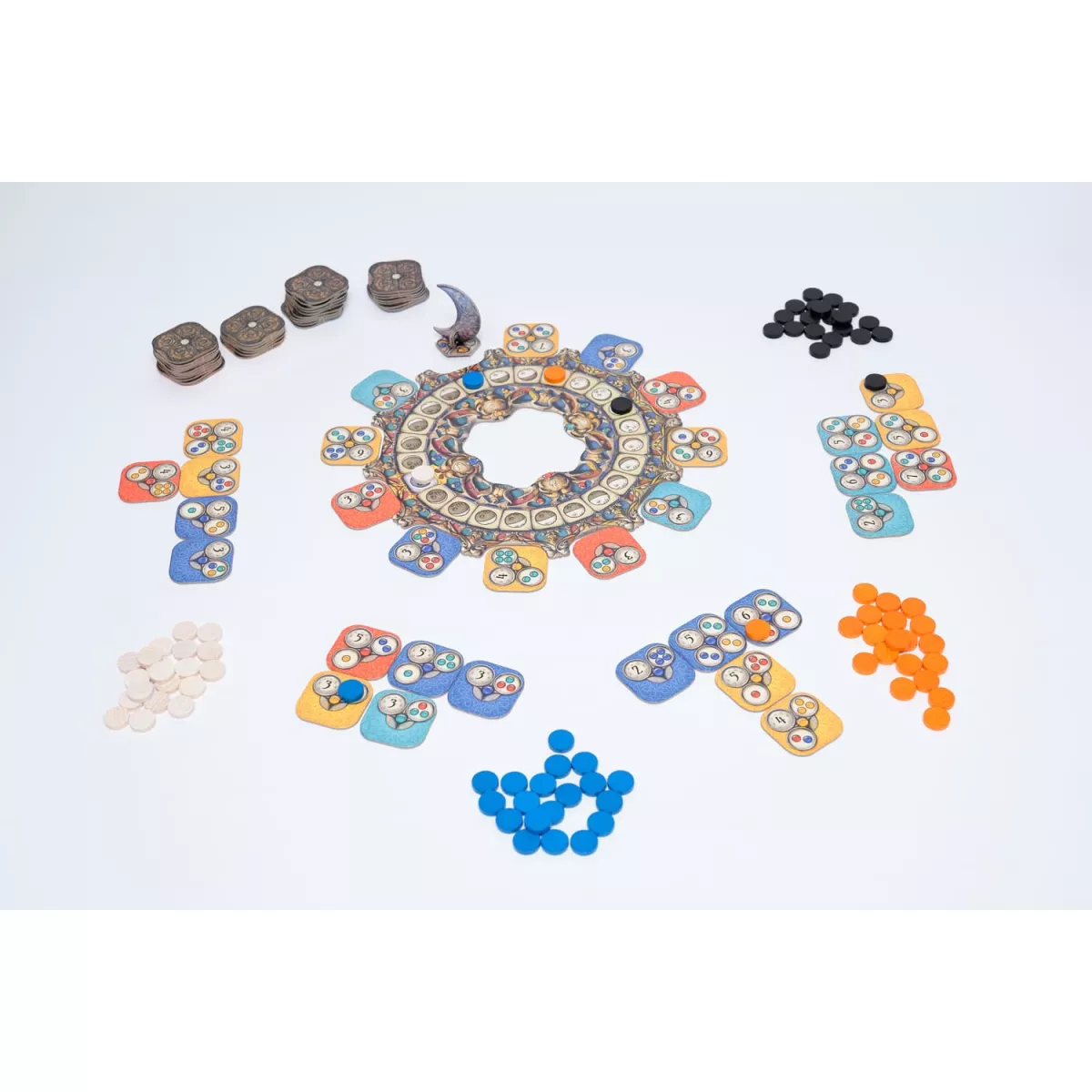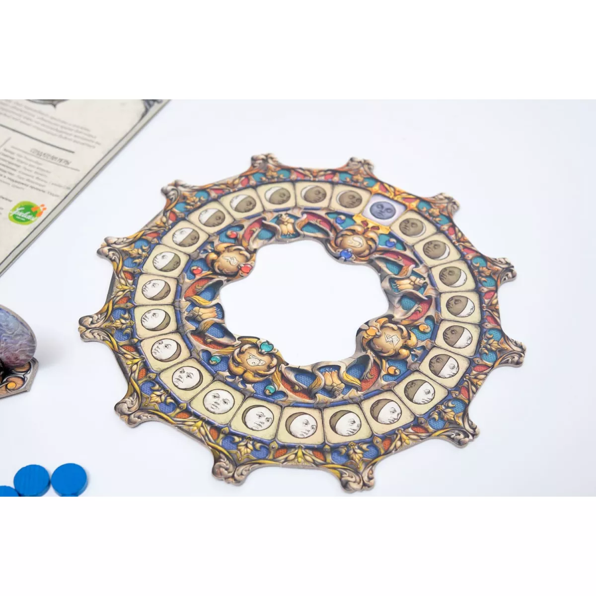 У коробці 1 місячне коло, 1 фігурка місяця, 68 плиток, 84 дерев'яні диски, Правила