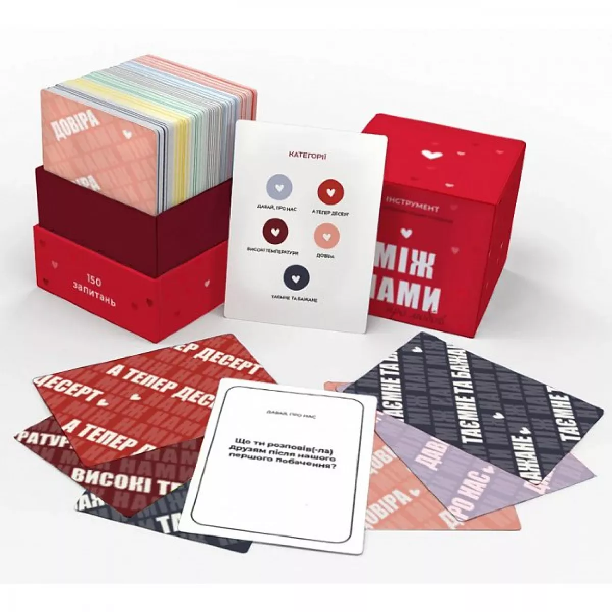 "Між нами: про любов 18+" надає можливість зануритися у світ інтимних розмов і дізнатися про свого партнера більше, ніж ви могли б собі уявити. У грі є 150 питань, які охоплюють найінтимніші аспекти життя. Від планів на майбутнє і спогадів, до найпотаємніших бажань і фантазій – кожне питання дозволяє відкрити нові грані стосунків.