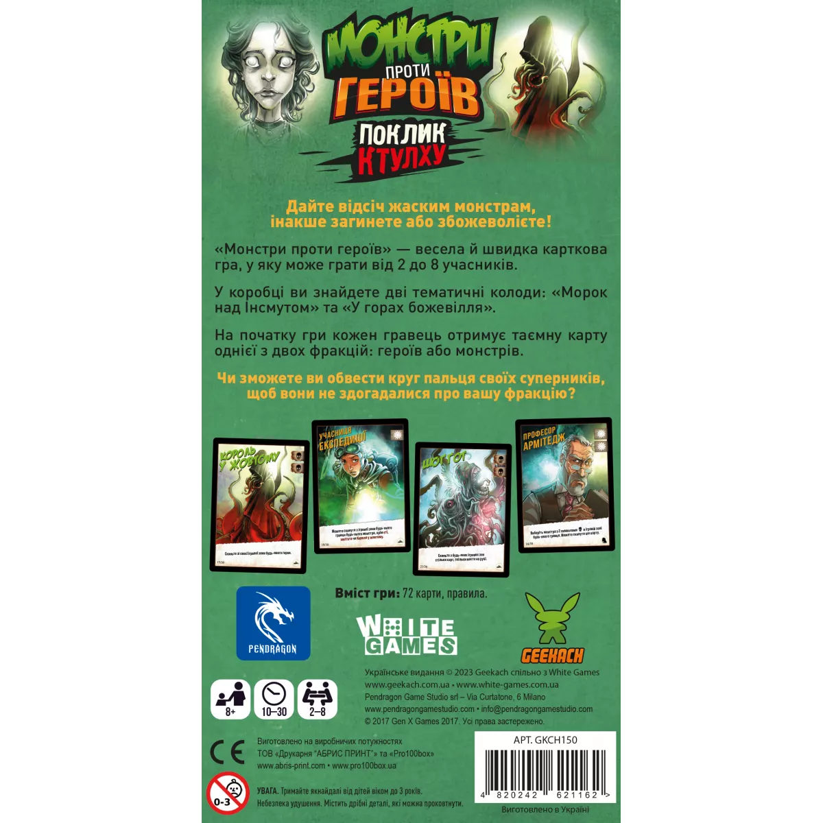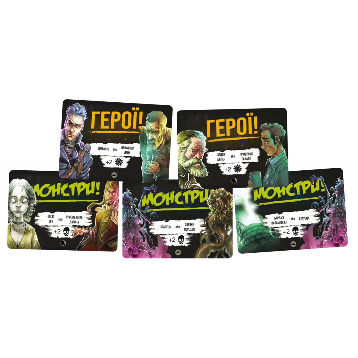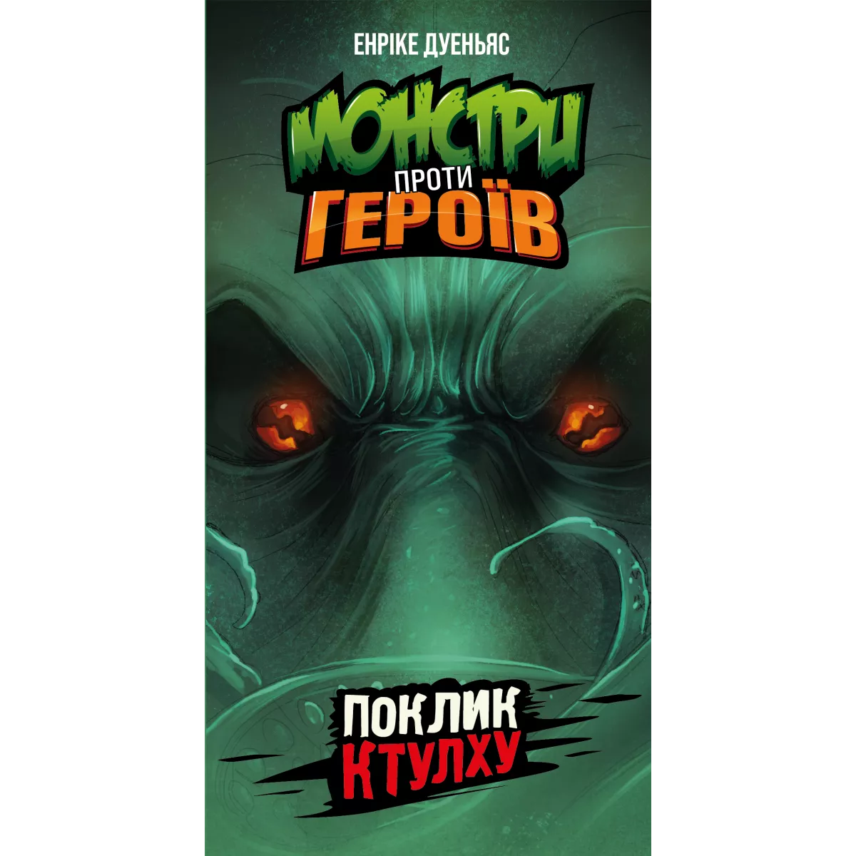 Із глибин океану знову чутно монотонний спів. Це означає, що вночі прибічники Ктулху вийдуть на сушу, аби провести свої таємничі ритуали. І багато невинних людей зникло б, якби не відважні герої, що стануть на захист містян! Настільна гра Монстри проти героїв. Поклик Ктулху, яка містить у собі колоди «Морок над Інсмутом» та «У горах божевілля»,  це швидка карткова гра для 2-8 гравців. Суть її полягає у тому, що кожен гравець повинен викласти перед собою карти тієї сторони протиборства, за яку він виступає. Звичайно ж, ніхто не зізнається, за добро він б’ється, чи за зло, адже тоді інші гравці можуть почати йому капостити. У чому суть ігрового процесу? У свій хід гравець або добирає карту з колоди, або розігрує карту з руки. Із добором все зрозуміло, ця механіка не сильно змінюється від гри до гри. А от з розіграшем є дуже багато цікавинок! На кожній карті у куточку є відмітка: це карта світла чи темряви. І карти світла принесуть вам переможні очки, якщо ви граєте за добро, а карти темряви – віднімуть. Ситуація аналогічна для фракції монстрів. То який сенс, спитаєте ви, розігрувати карти, які не підходять кольору вашої фракції? Спершу, аби заплутати інших гравців і не видати свою фракцію занадто рано. Та разом з тим кожна із 30 карт має свою унікальну здібність, яка дозволить прибрати карти, розіграні іншими гравцями, вкрасти карту з руки, скинути свої непотрібні карти або ще десятки різних здібностей. Також може статися ситуація, коли всі карти у вас на руці не підійдуть вашій фракції. Скинути карти з руки неможливо, якщо це не особливий ефект розіграшу монстра чи героя, тому доведеться викручуватись, як вийде! А хто ж буде королем цієї ночі? Переможцем у партії стане той гравець, хто буде мати найбільше персонажів своєї фракції, за вирахуванням істот супротивника у той момент, коли колода героїв та монстрів закінчиться. Необхідно згадати, що у грі присутній ускладнений режим для двох гравців, якщо ви хочете провести справді серйозну дуельну сутичку, створивши унікальні колоди для гравців. Тож якщо вас зацікавила гра, у якій є трохи прихованих ролей, трохи стратегії, ціла купа різноманіття та можливість комбінувати колоди з іншими іграми серії – вам точно варто придбати коробочку з грою Монстри проти героїв. Поклик Ктулху. Якщо ж ви хочете, аби на вулиці Інсмуту вийшли герої класичних британських творів та пекельні істоти – зверніть увагу на самостійне доповнення Монстри проти героїв. Вікторіанські жахи, героїв та монстрів з якої можна вільно додавати до Поклику Ктулху, створюючи ще більш різноманітні комбінації карт та збираючи унікальні ігрові колоди.