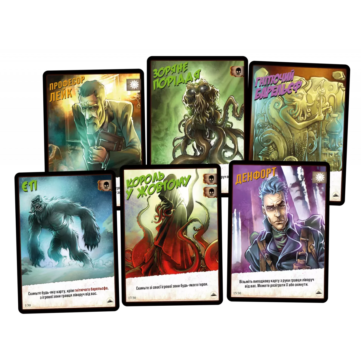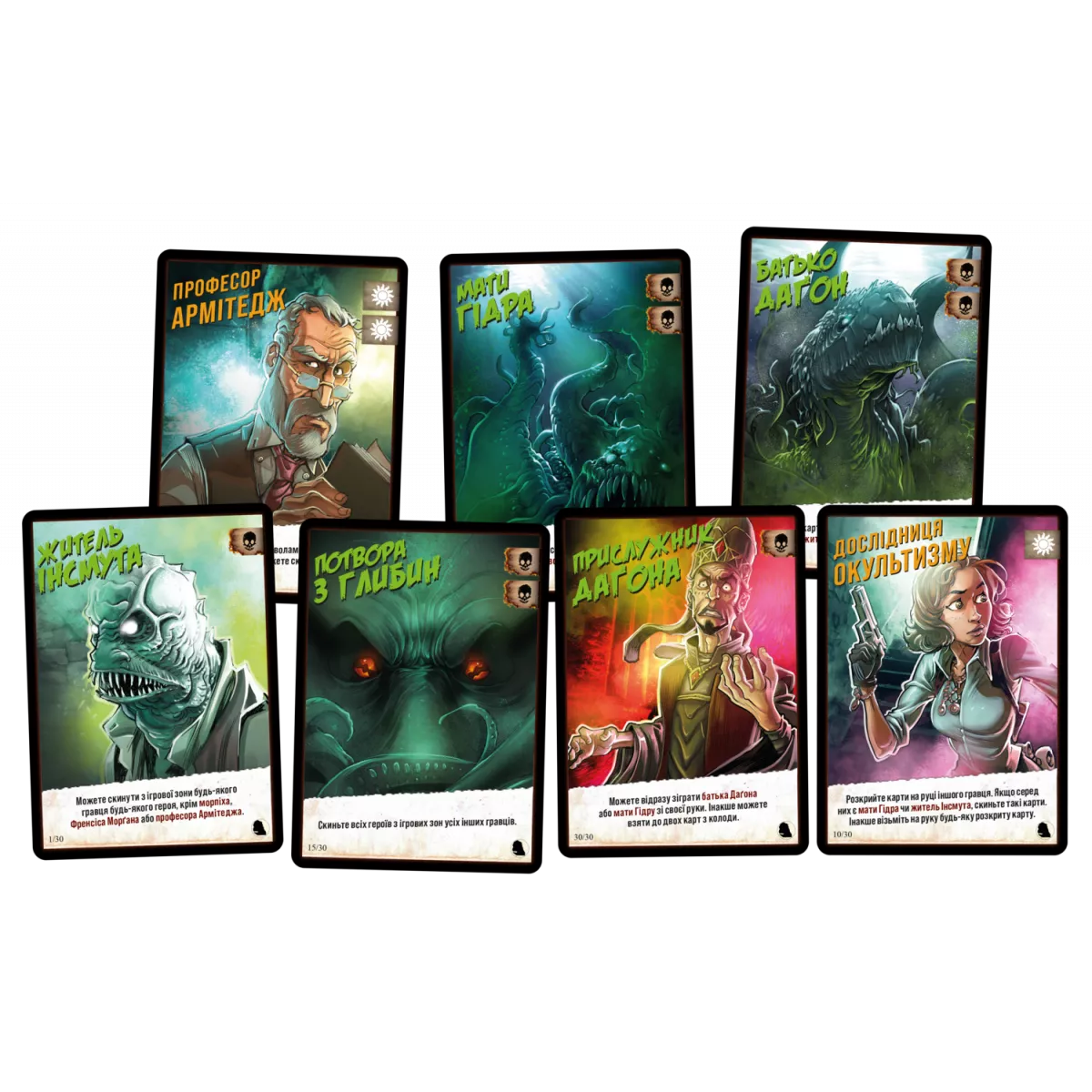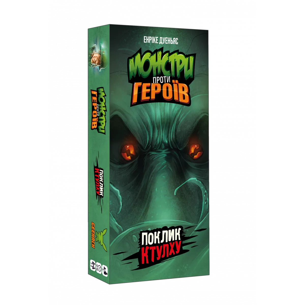 Із глибин океану знову чутно монотонний спів. Це означає, що вночі прибічники Ктулху вийдуть на сушу, аби провести свої таємничі ритуали. І багато невинних людей зникло б, якби не відважні герої, що стануть на захист містян! Настільна гра Монстри проти героїв. Поклик Ктулху, яка містить у собі колоди «Морок над Інсмутом» та «У горах божевілля»,  це швидка карткова гра для 2-8 гравців. Суть її полягає у тому, що кожен гравець повинен викласти перед собою карти тієї сторони протиборства, за яку він виступає. Звичайно ж, ніхто не зізнається, за добро він б’ється, чи за зло, адже тоді інші гравці можуть почати йому капостити. У чому суть ігрового процесу? У свій хід гравець або добирає карту з колоди, або розігрує карту з руки. Із добором все зрозуміло, ця механіка не сильно змінюється від гри до гри. А от з розіграшем є дуже багато цікавинок! На кожній карті у куточку є відмітка: це карта світла чи темряви. І карти світла принесуть вам переможні очки, якщо ви граєте за добро, а карти темряви – віднімуть. Ситуація аналогічна для фракції монстрів. То який сенс, спитаєте ви, розігрувати карти, які не підходять кольору вашої фракції? Спершу, аби заплутати інших гравців і не видати свою фракцію занадто рано. Та разом з тим кожна із 30 карт має свою унікальну здібність, яка дозволить прибрати карти, розіграні іншими гравцями, вкрасти карту з руки, скинути свої непотрібні карти або ще десятки різних здібностей. Також може статися ситуація, коли всі карти у вас на руці не підійдуть вашій фракції. Скинути карти з руки неможливо, якщо це не особливий ефект розіграшу монстра чи героя, тому доведеться викручуватись, як вийде! А хто ж буде королем цієї ночі? Переможцем у партії стане той гравець, хто буде мати найбільше персонажів своєї фракції, за вирахуванням істот супротивника у той момент, коли колода героїв та монстрів закінчиться. Необхідно згадати, що у грі присутній ускладнений режим для двох гравців, якщо ви хочете провести справді серйозну дуельну сутичку, створивши унікальні колоди для гравців. Тож якщо вас зацікавила гра, у якій є трохи прихованих ролей, трохи стратегії, ціла купа різноманіття та можливість комбінувати колоди з іншими іграми серії – вам точно варто придбати коробочку з грою Монстри проти героїв. Поклик Ктулху. Якщо ж ви хочете, аби на вулиці Інсмуту вийшли герої класичних британських творів та пекельні істоти – зверніть увагу на самостійне доповнення Монстри проти героїв. Вікторіанські жахи, героїв та монстрів з якої можна вільно додавати до Поклику Ктулху, створюючи ще більш різноманітні комбінації карт та збираючи унікальні ігрові колоди.