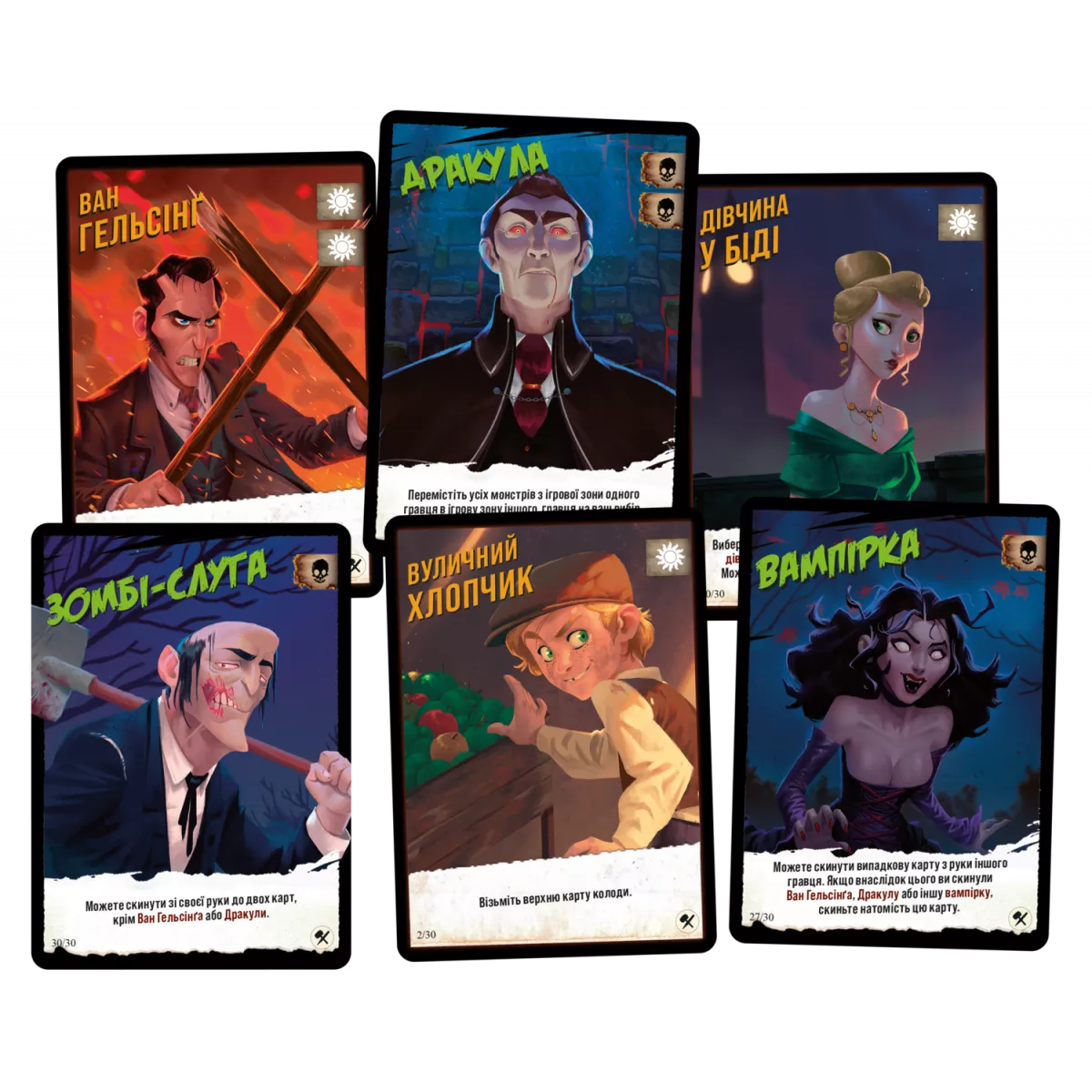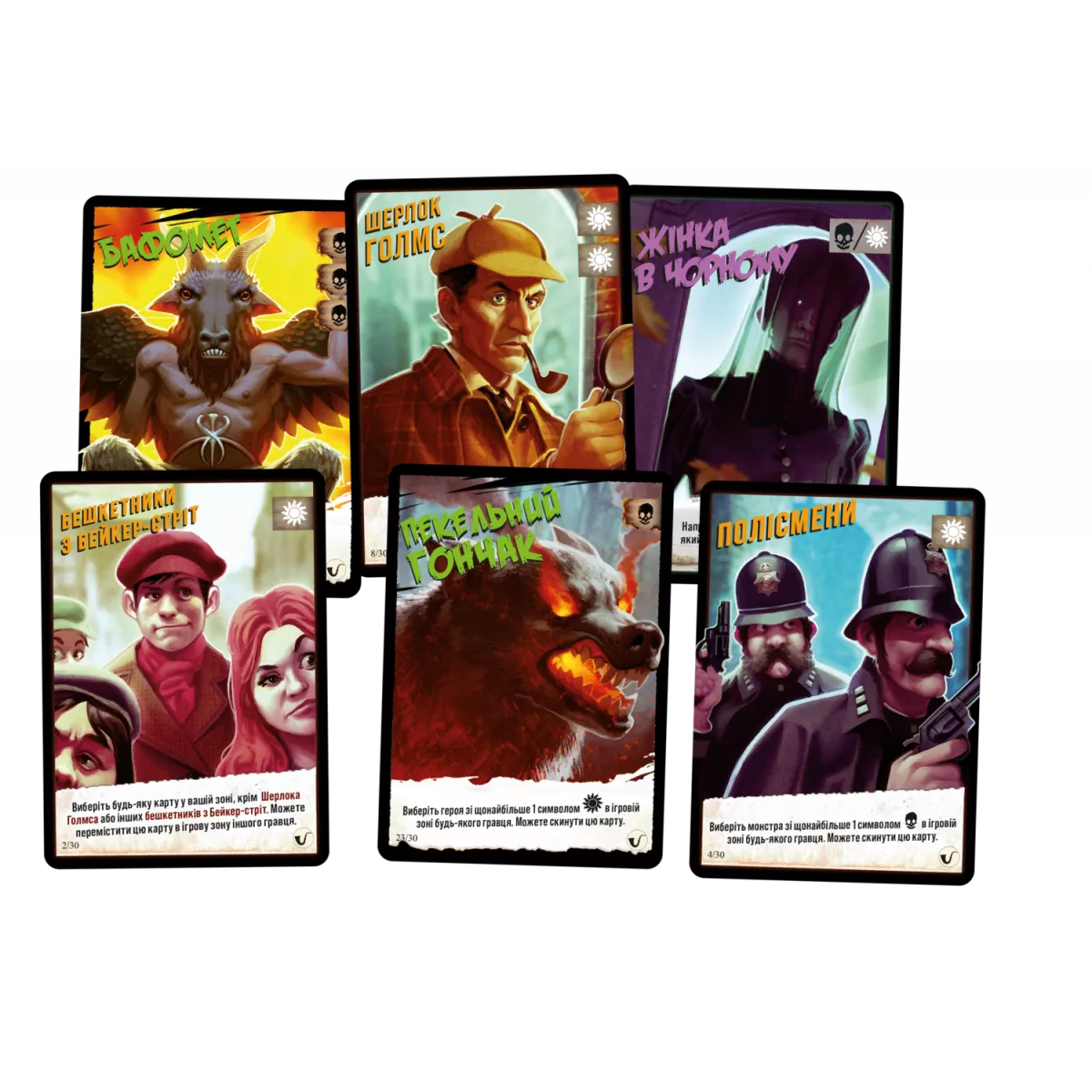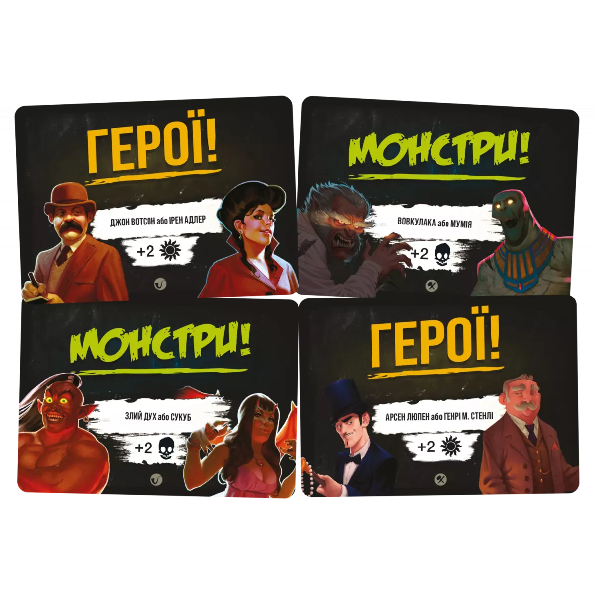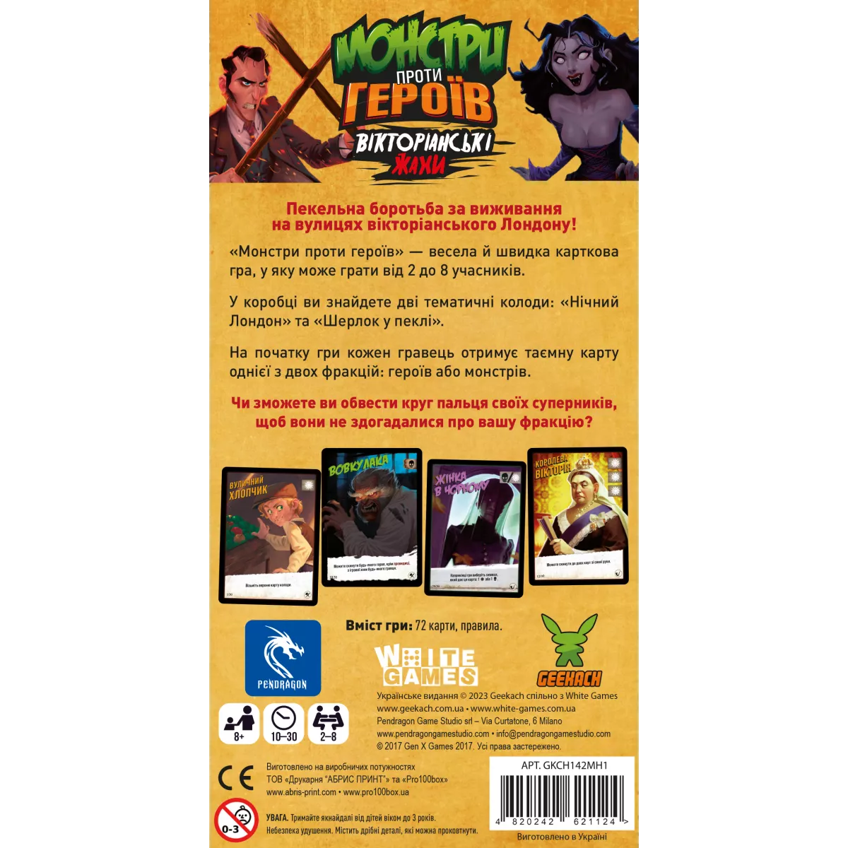 На темних вулицях Лондона знову діється щось таємниче. Монстри та пекельні створіння вийшли на полювання за безвинними жертвами! Добре, що зі сторінок класичних творів та міських легенд спустилися герої, які готові протистояти навалі темряви. Настільна гра Монстри проти героїв. Вікторіанські жахи, яка містить у собі колоди «Шерлок у пеклі» та «Нічний Лондон», - це швидка карткова гра для 2-8 гравців. Суть її полягає у тому, що кожен гравець повинен викласти перед собою карти тієї сторони протиборства, за яку він виступає. Звичайно ж, ніхто не зізнається, за добро він б’ється, чи за зло, адже тоді інші гравці можуть почати йому капостити. У чому суть ігрового процесу? У свій хід гравець або добирає карту з колоди, або розігрує карту з руки. Із добором все зрозуміло, ця механіка не сильно змінюється від гри до гри. А от з розіграшем є дуже багато цікавинок! На кожній карті у куточку є відмітка: це карта світла чи темряви. І карти світла принесуть вам переможні очки, якщо ви граєте за добро, а карти темряви – віднімуть. Ситуація аналогічна для фракції монстрів. То який сенс, спитаєте ви, розігрувати карти, які не підходять кольору вашої фракції? Спершу, аби заплутати інших гравців і не видати свою фракцію занадто рано. Та разом з тим, кожна із 30 карт має свою унікальну здібність, яка дозволить прибрати карти, розіграні іншими гравцями, вкрасти карту з руки, скинути свої непотрібні карти або ще десятки різних здібностей. Також може статися ситуація, коли всі карти у вас на руці не підійдуть вашій фракції. Скинути карти з руки неможливо, якщо це не особливий ефект розіграшу монстра чи героя, тому доведеться викручуватись, як виходить! А хто ж буде королем цієї ночі? Переможцем у партії стане той гравець, хто буде мати найбільше персонажів своєї фракції, за вирахуванням істот супротивника у той момент, коли колода героїв та монстрів закінчиться. Тож якщо вас зацікавила гра, у якій є трохи прихованих ролей, трохи стратегії, ціла купа різноманіття та можливість комбінувати колоди з іншими іграми серії – вам точно варто придбати коробочку з грою Монстри проти героїв. Вікторіанські жахи. Та якщо ви бажаєте урізноманітнити сеттінг вікторіанського Лондону мітами із найтемніших глибин океану – зверніть увагу на самостійне доповнення до гри Монстри проти героїв. Поклик Ктулху, яке можна інтегрувати з частиною Вікторіанські жахи, аби внести ще більше веселощів, різноманіття та хаосу!
