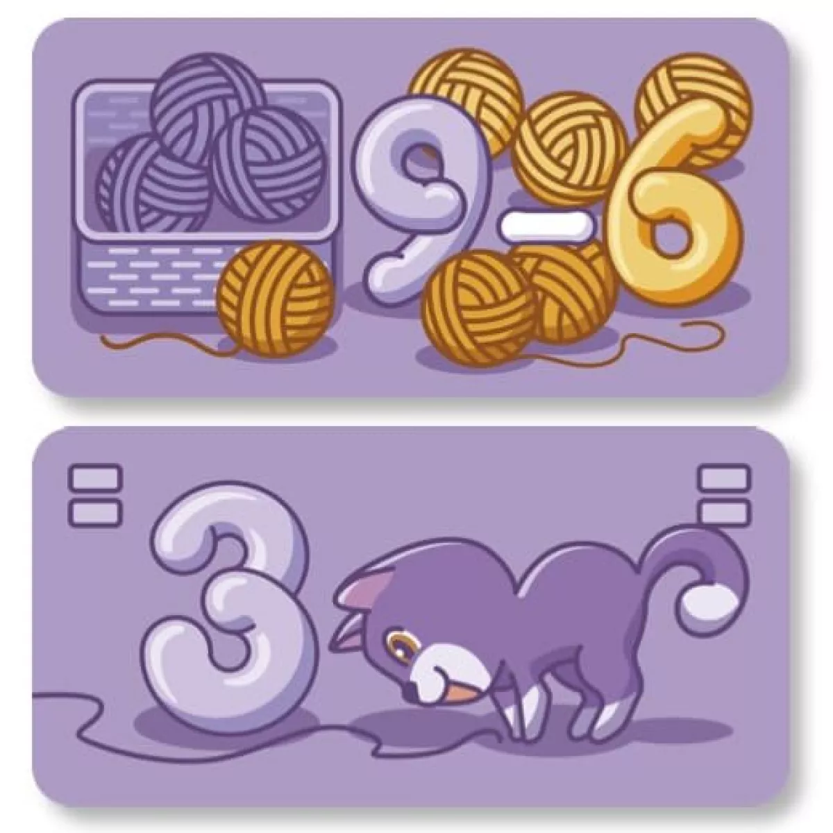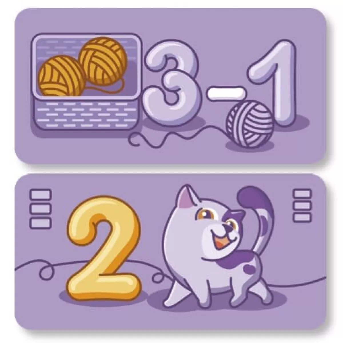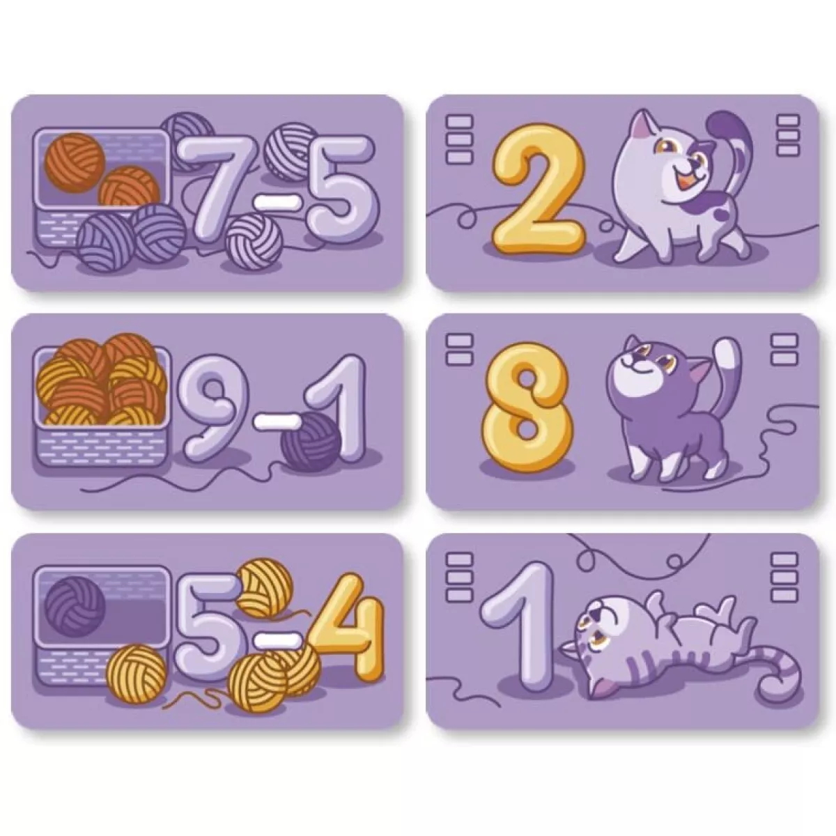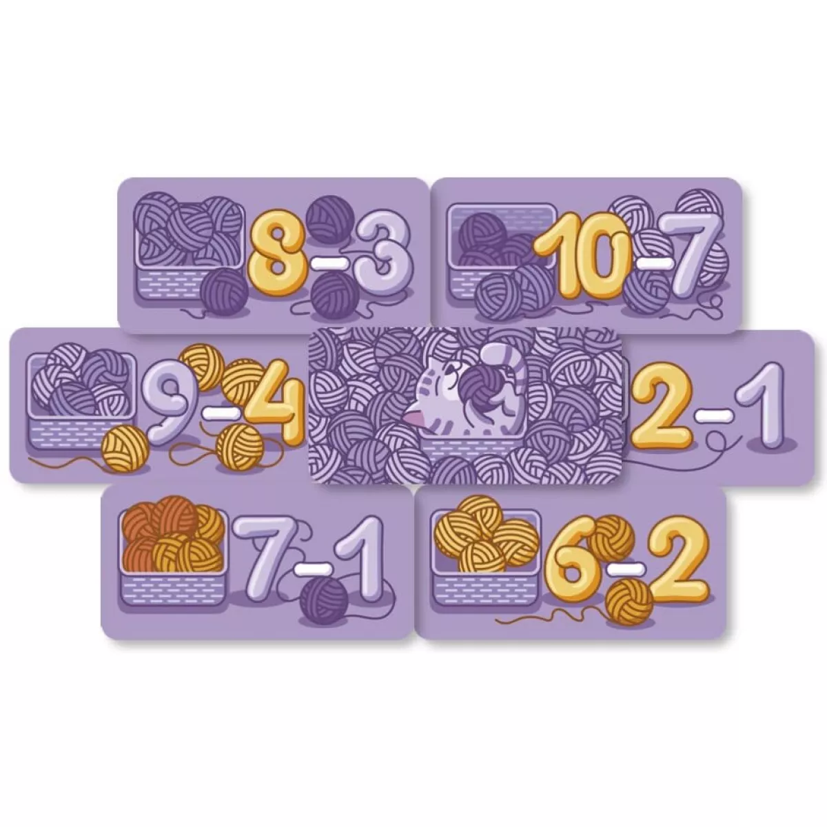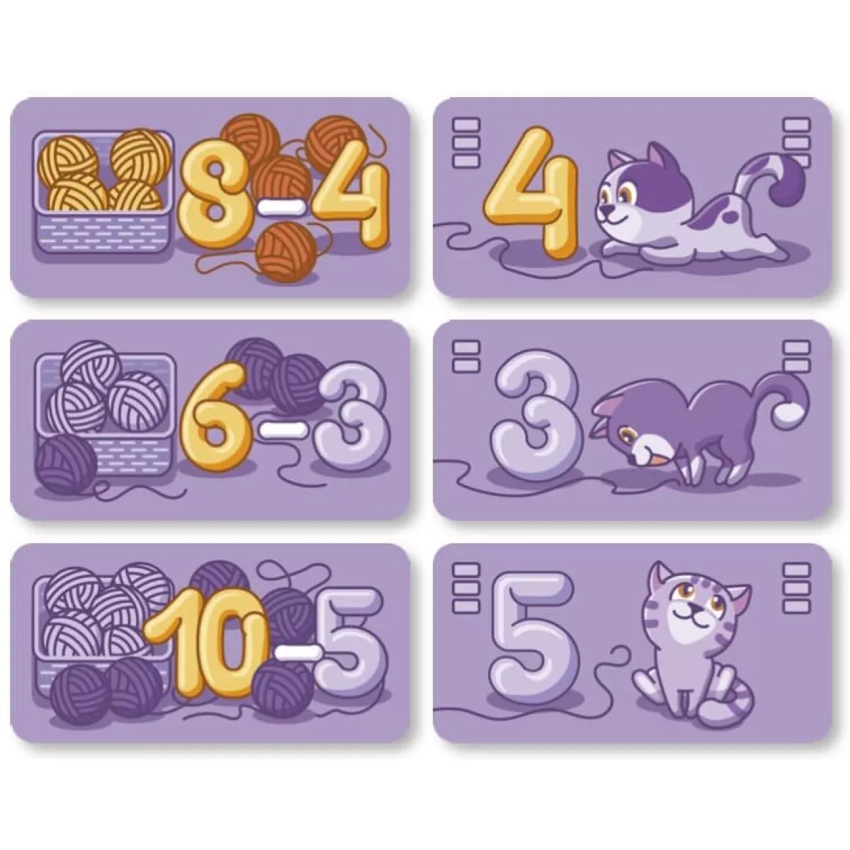 Кошенятка Шустрик, Рябчик та Зоринка так бавились, що клубочки переплутались. Тепер кожному котику треба залишити у своєму кошику потрібні клубочки. З вами вони справляться значно краще! В коробці 63 картки та дві веселі гри з котиками та клубочками. Гра допомагає вивчити склад числа та віднімання  в межах 10, знайомить з парними та непарними числами.