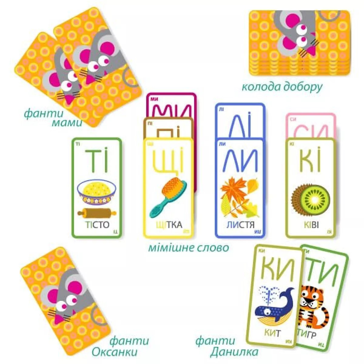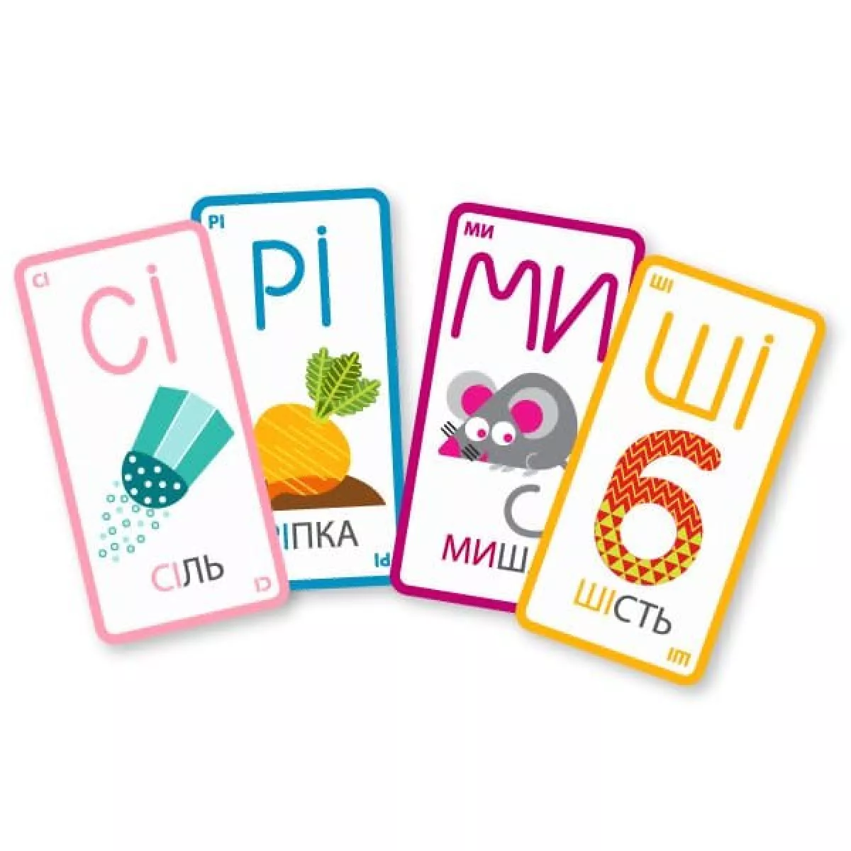 У комплекті 40 парних карт з буквосполученнями - всі приголосні букви з голосними «І» та «И» - з малюнками й повними назвами того, що зображено.