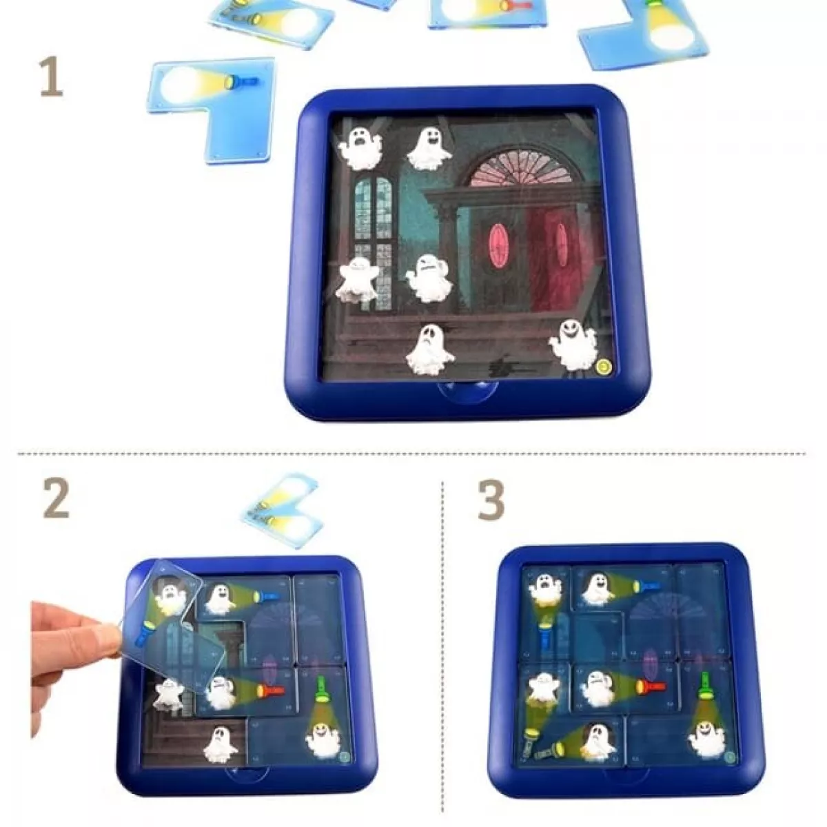 Давним-давно, ще наприкінці минулого століття, світ побачив веселий фільм під назвою Мисливці за привидами. Він швидко знайшов фанатів по всьому світу, тож і різноманітні продовження у вигляді інших кінокартин чи мультсеріалів не змусили себе довго чекати. Тому й не дивно, що є доволі цікава гра-головоломка для дітей і всієї сім’ї, що так і називається – Мисливці за привидами. Запасайтесь ліхтариками та не бійтеся того, що ви можете знайти в закинутому замку. Кажуть, що примари дуже бояться світла Мисливці за привидами – це захоплива головоломка від компанії Smart Games. У кожному з 60 завдань учасник повинен розмістити всі ігрові елементи на полі так, щоби привиди опинилися під світлом ліхтариків. Будьте уважні, адже кожна з місій має лише одну правильну відповідь. Отож, усього є 6 прозорих елементів різної форми, які й необхідно якось розташувати на ігровому полі. Розміщення привидів кожного разу буде змінюватися в залежності від завдання. Усе, що вам потрібно зробити – викласти ліхтарики так, щоби жодна примара не залишилась у темряві. Це ж ваша робота! Звичайно ж, завдання є різного рівня складності, що підійде як для початківців, так і для експертів у розв’язанні подібних головоломок.