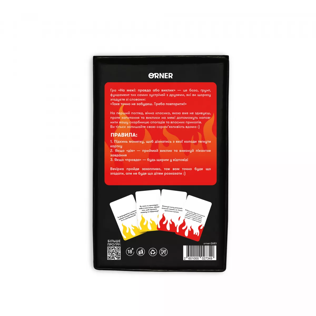 «На межі: Правда або Виклик» — розмовна гра для гучної компанії, де ви зможете дізнатися секрети, про які ніхто не наважувався спитати. Навіть серед незнайомих людей вона допомагає швидко знайти спільну мову та зблизитися.