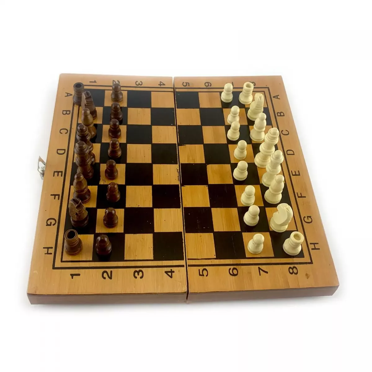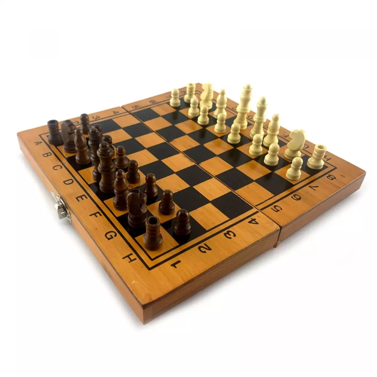 Дерев'яний набір з шаховим полем ззовні та полем для нардів всередині. Кейс з металевими замочками. Розмір – 24 х 12 см у складеному і 24 х 24 см у розкладеному. Довговічний та стильний подарунок 2 в 1.