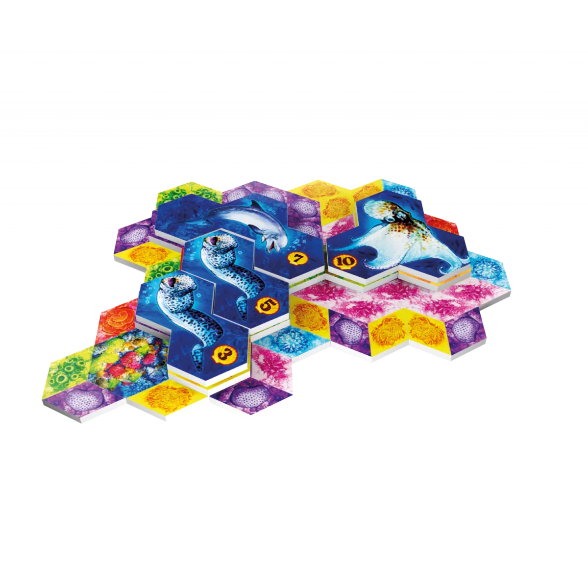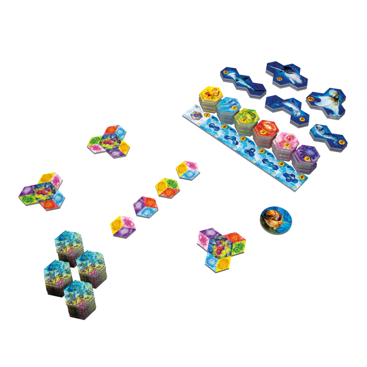 У коробці 70 плиток коралів, 72 плитки малих тварин, 15 плиток великих тварин, 24 жетони екосистем, 1 жетон морського равлика, 4 плитки осередків, 1 блокнот для підрахунку очок, Правила