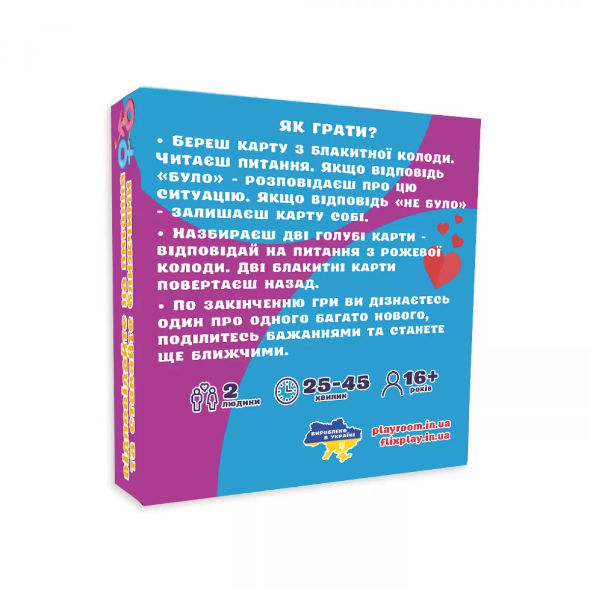 Романтичні питання для закоханої пари. Відповідайте на запитання і стаєте ближчим. Як грати? Береш карту із блакитної колоди. Читаєш запитання. Якщо відповідь «БУЛО» - розповідаєш про цю ситуацію. Якщо відповідь «НЕ БУЛО» - залишаєш картку собі. Назбирав дві блакитні карти – відповідаєш на запитання з рожевої колоди. Дві блакитні карти повертаєш. Після закінчення гри ви дізнаєтеся один про одного багато нового, поділитеся бажаннями і станете ще ближче. Що в коробці? 50 блакитних карт з питанням, відповідь на яке «БУЛО» або «НЕ БУЛО». 15 рожевих карток, де на запитання потрібно відповідати розгорнуто. У грі основна частина романтичні питання, також є трохи вульгарні, особисті і кілька веселих питань :)