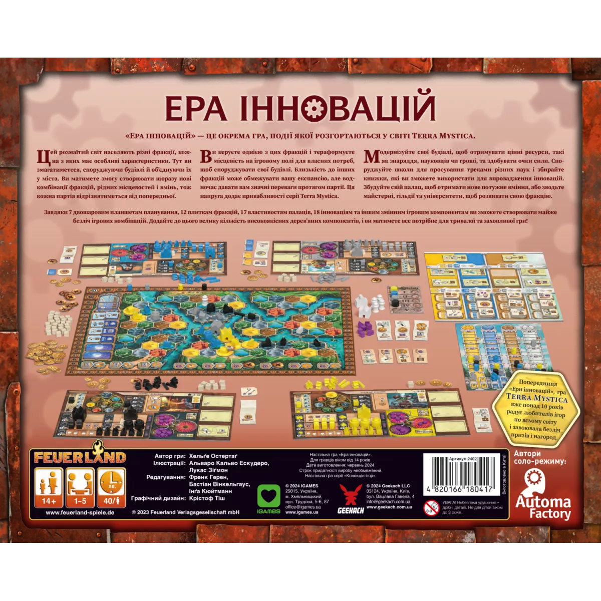 «Ера інновацій» – це самостійна гра, яка розширює всесвіт культової «Terra Mystica», пропонуючи глибшу стратегію, більше варіативності та нові механіки. Ви – лідер унікальної фракції, яка бореться за панування через розвиток технологій, будівництво міст та впровадження революційних інновацій. Кожна партія – це новий виклик, адже комбінації фракцій, особливих вмінь і стартових умов роблять кожну гру неповторною.