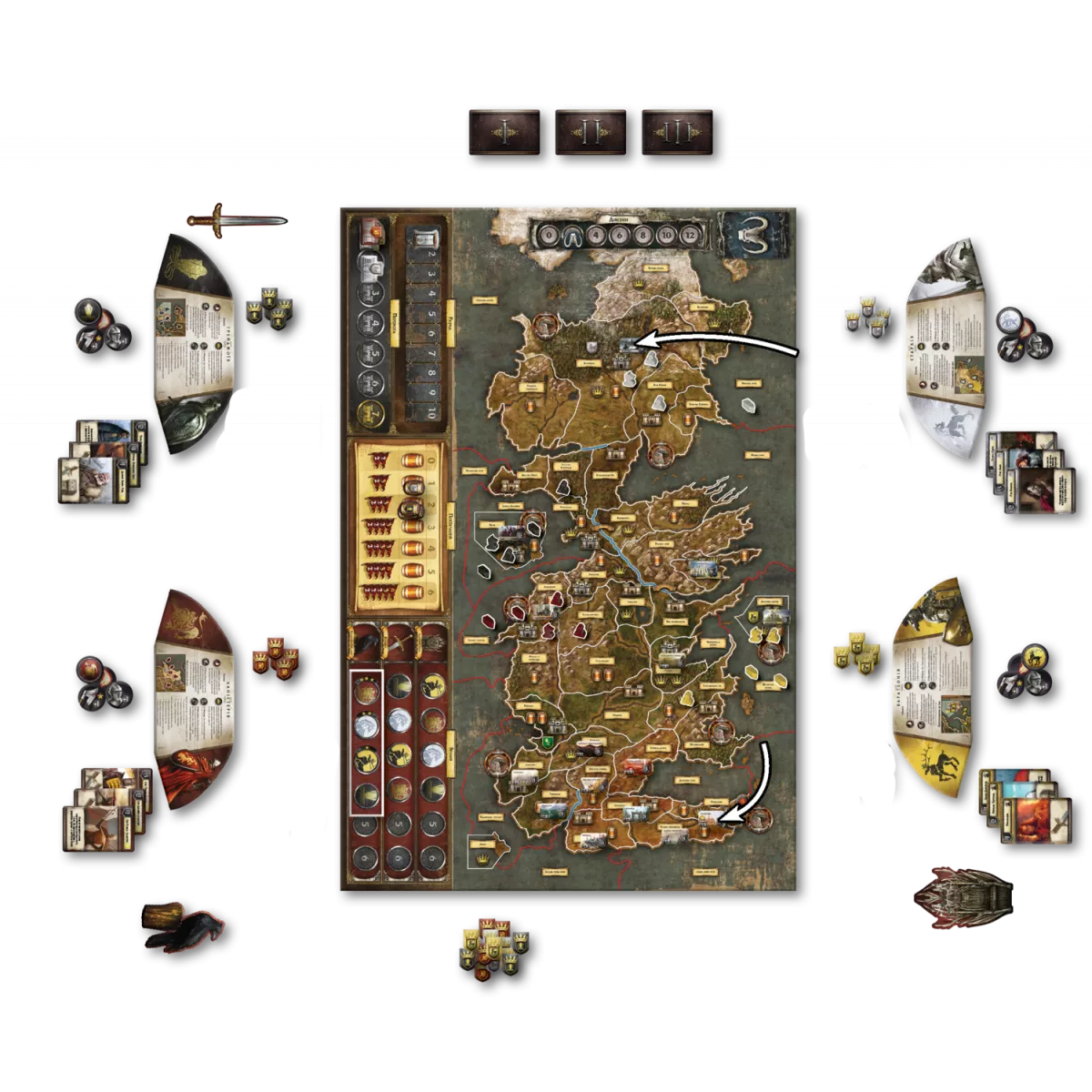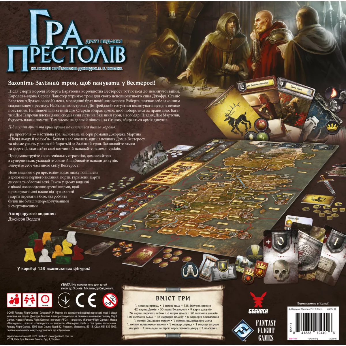 У коробці Книжка правил, Ігрове поле, 138 фігурок загонів (6 різних кольорів) -, • 60 солдатів (по 10 кожного з 6 Домів), • 30 лицарів (по 5 кожного з 6 Домів), • 36 кораблів (по 6 кожного з 6 Домів), • 12 облогових веж (по 2 кожного з 6 Домів), 105 карт -, • 42 карти Домів (по 7 кожного з 6 Домів), • 30 карт Вестеросу, • 9 карт дикунів, • 24 карти переваги в бою, 2 пам’ятки, 6 ширм Домів, 266 жетонів -, • 90 жетонів наказів (по 15 кожного з 6 Домів), • 120 жетонів влади (по 20 кожного з 6 Домів), • 18 маркерів впливу (по 3 кожного з 6 Домів), • 6 маркерів постачання (по 1 кожного з 6 Домів), • 14 жетонів нейтральних лордів, • 6 маркерів перемоги (по 1 кожного з 6 Домів), • 6 жетонів гарнізонів (по 1 кожного з 6 Домів), • 1 жетон Залізного трону, • 1 жетон валірійського меча, • 1 жетон поштового ворона, • 1 маркер раунду, • 1 маркер загрози дикунів, • 1 накладка на трек королівського двору