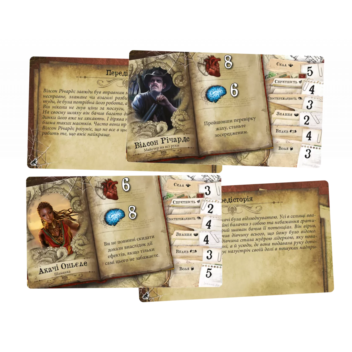 • І більше! Карти поранень і жахів, предметів і заклинань, жетони персонажів, вогню/темряви, стін, доказів, а також ключів, які дозволять не втратити ключові для дослідників предмети в разі невдачі.
