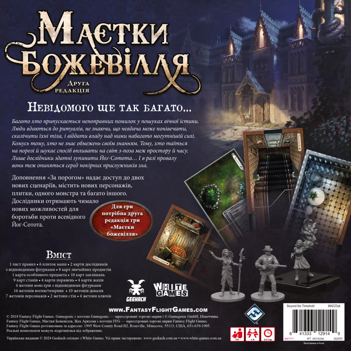 Доповнення «За порогом» розширює світ «Маєтків божевілля», додаючи нові виклики, персонажів та механіки, які зроблять ваші пригоди ще більш захопливими та непередбачуваними. Чи готові ви переступити поріг невідомого?