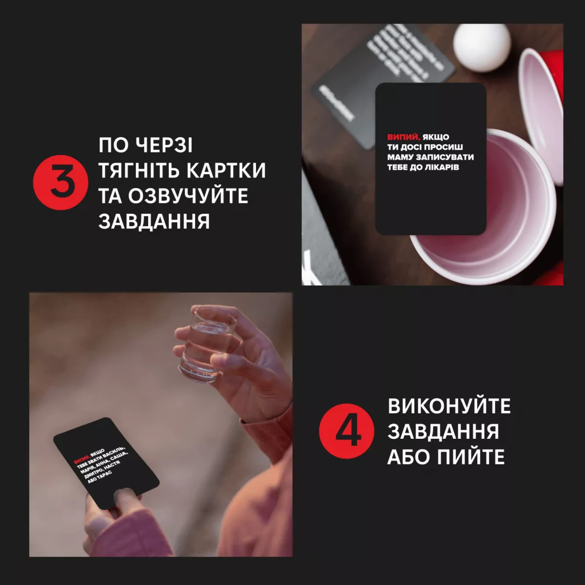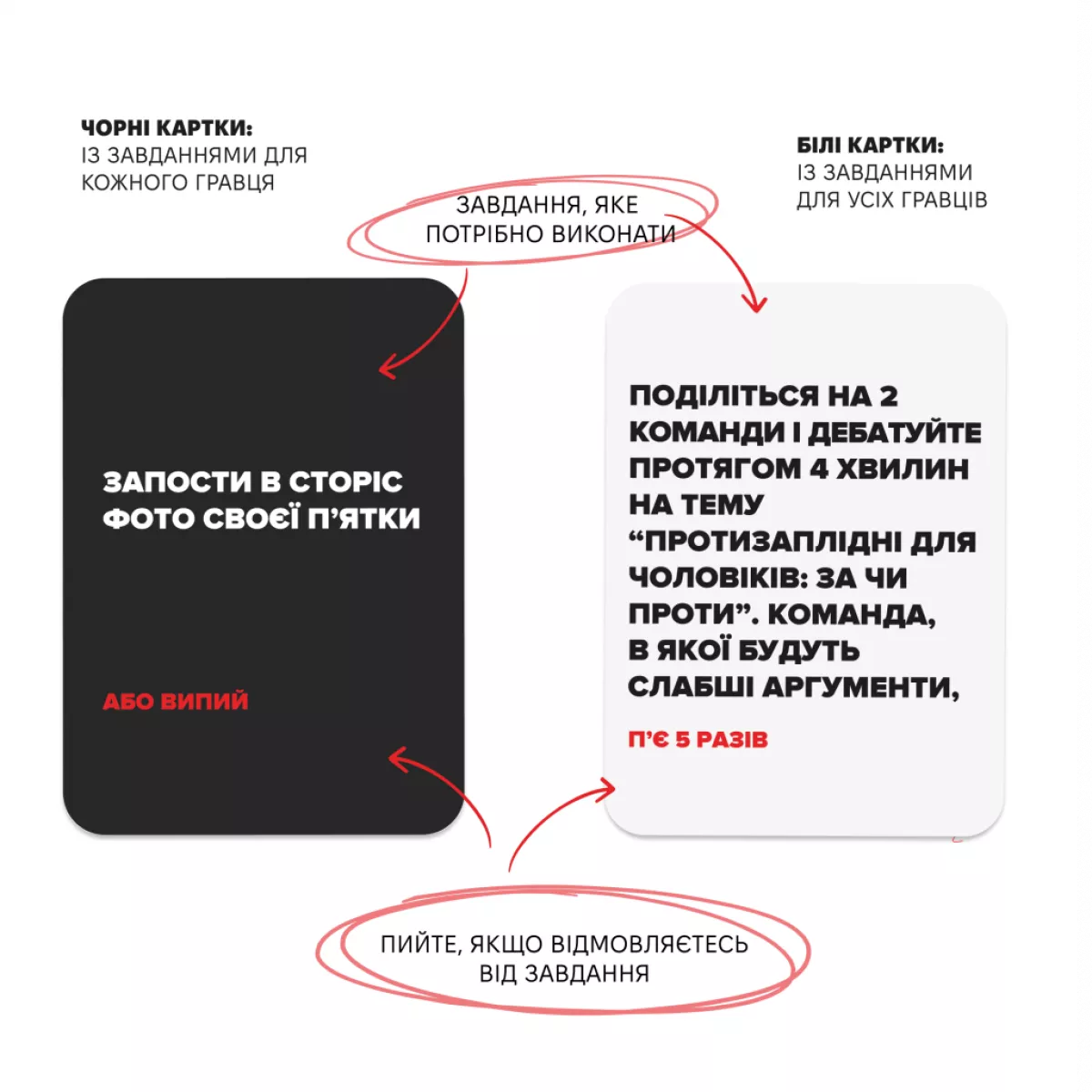 В комплекті 180 завдань, серед яких персональні чорні карти та загальні білі. Всі вони замішуються в одну колоду, а гравці відкривають по одній по черзі.