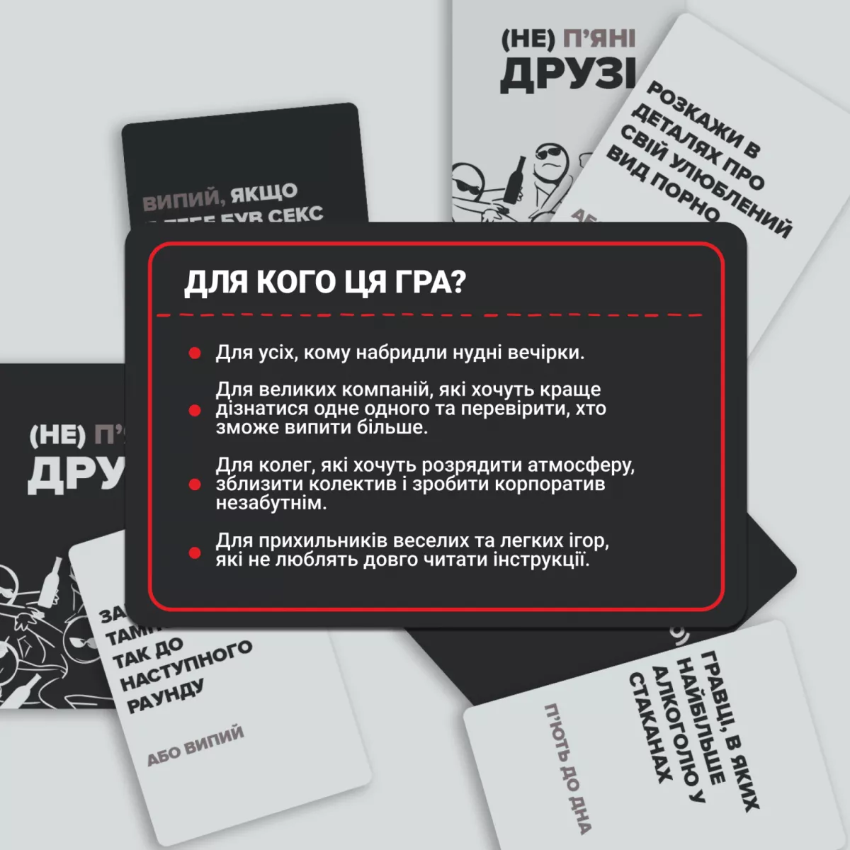 «(Не) пʼяні друзі» — дуже весела алкогольна гра для компанії від 2 гравців і більше! Чудово підійде як для найближчих, так і нової компанії, або сміливих колег. Це ідеальний варіант для Дня народження чи корпоративу.